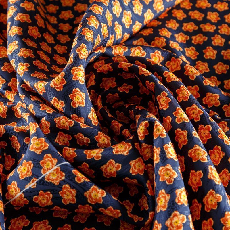 Итальянский матовый жаккардовый шелк с ярким цветочным принтом. Ткань средней плотности, не просвечивает, струится, хорошо драпируется. Поверхность глядкая, имеет благородный сатиновый блеск. Подойдет смелых образов: летних платьев и сарафанов, как летящих фасонов, так и скроенных по косой, накидок, юбок, блузок, костюмов, широких брюк, домашней одежды.