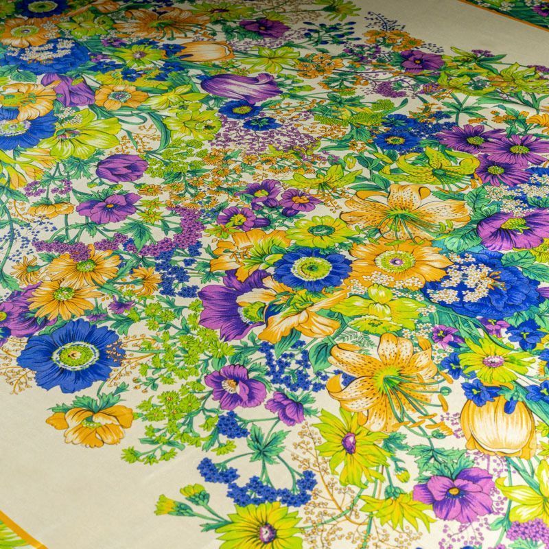 Итальянский атласный шелк с ярким цветным растительным принтом. Вдоль кромки оформлен цветными полосами в тон рисунку. Можно использовать в изделии по длине ткани и объемом. Ткань средней плотности, не просвечивает, струится, хорошо драпируется, не много тянется за счет эластана в составе. Поверхность глядкая, имеет благородный сатиновый блеск. Подойдет для смелых образов: летних платьев и сарафанов, как летящих фасонов, так и скроенных по косой, накидок, юбок, блузок, костюмов, широких брюк, домашней одежды.