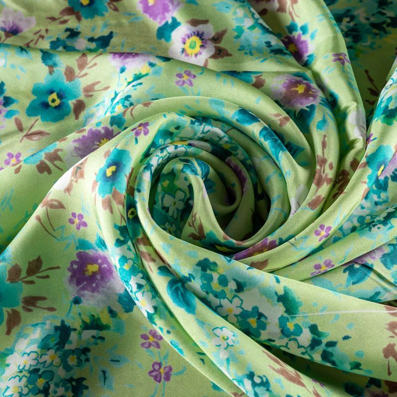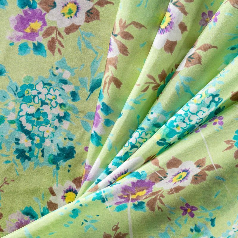 Итальянский атласный шелк с красивым акварельным цветочным принтом на освежающем мятном фоне. Ткань средней плотности, не просвечивает, струится, хорошо драпируется. Поверхность глядкая, имеет благородный сатиновый блеск. Подойдет для летних платьев, накидок, юбок, блузок, костюмов, широких брюк, домашней одежды.