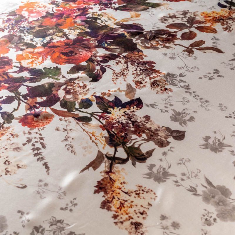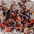 Эффектный и стильный шелк-купон с крупными цветочным принтом в осенней гамме на молочно- жемчужном фоне. Шелк средней плотности, не просвечивает, струится, хорошо драпируется. Поверхность глядкая, имеет благородный сатиновый блеск. Подойдет для летних платьев, накидок, юбок, блузок, костюмов, широких брюк, домашней одежды. Набирается на изделие объемом.