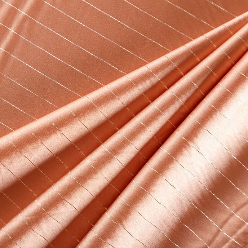 Тонкая, легкая, струящаяся ткань, декорированная тонкими вертикальными полосками люресовой нити, не просвечивает, очень нежная и прятная к телу, обладает благородным атласным блеском, хорошо драпируется, тянется за счет эластана в составе. Идеально подойдет для пошива блузок, платьев и юбок, а также топов, платков, домашней одежды.