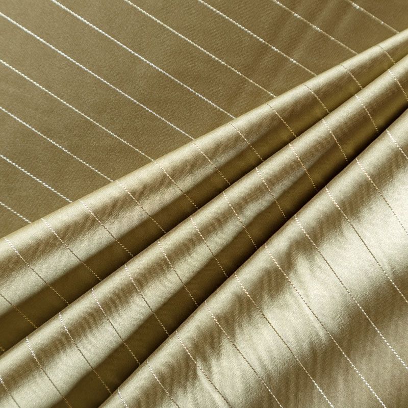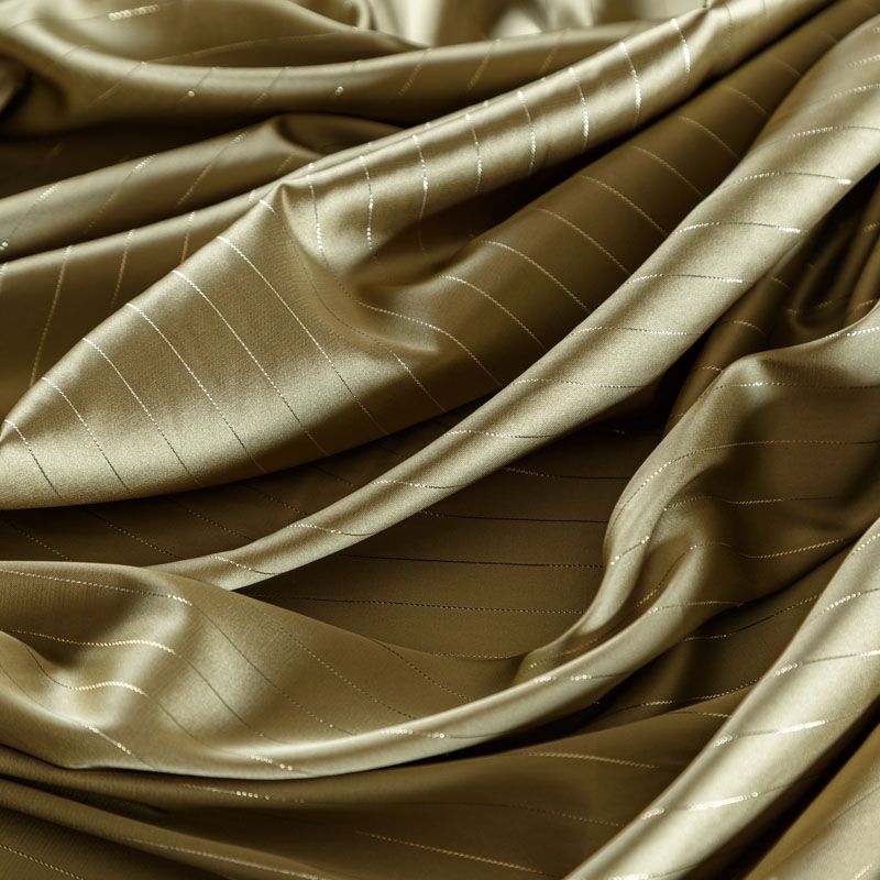Тонкая, легкая, струящаяся ткань, декорированная тонкими вертикальными полосками люресовой нити, не просвечивает, очень нежная и прятная к телу, обладает благородным атласным блеском, хорошо драпируется, тянется за счет эластана в составе. Идеально подойдет для пошива блузок, платьев и юбок, а также топов, платков, домашней одежды.