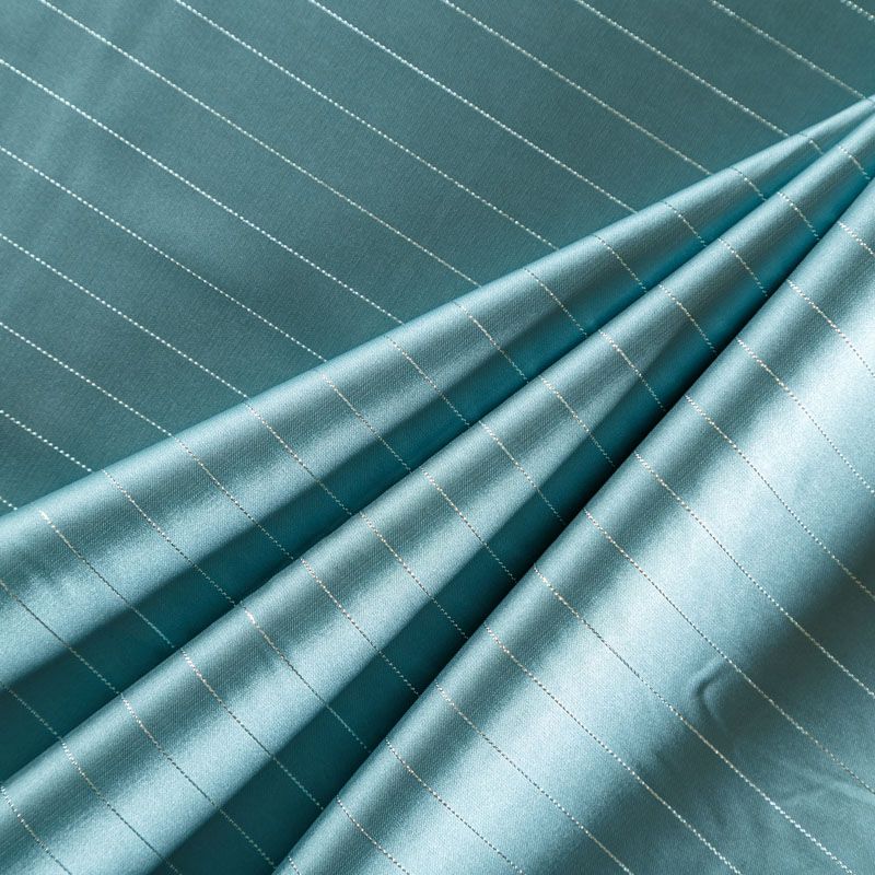 Тонкая, легкая, струящаяся ткань, декорированная тонкими вертикальными полосками люресовой нити, не просвечивает, очень нежная и прятная к телу, обладает благородным атласным блеском, хорошо драпируется, тянется за счет эластана в составе. Идеально подойдет для пошива блузок, платьев и юбок, а также топов, платков, домашней одежды.