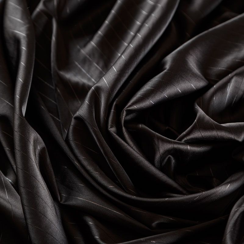Тонкая, легкая, струящаяся ткань, декорированная тонкими вертикальными полосками люресовой нити, не просвечивает, очень нежная и прятная к телу, обладает благородным атласным блеском, хорошо драпируется, тянется за счет эластана в составе. Идеально подойдет для пошива блузок, платьев и юбок, а также топов, платков, домашней одежды.
