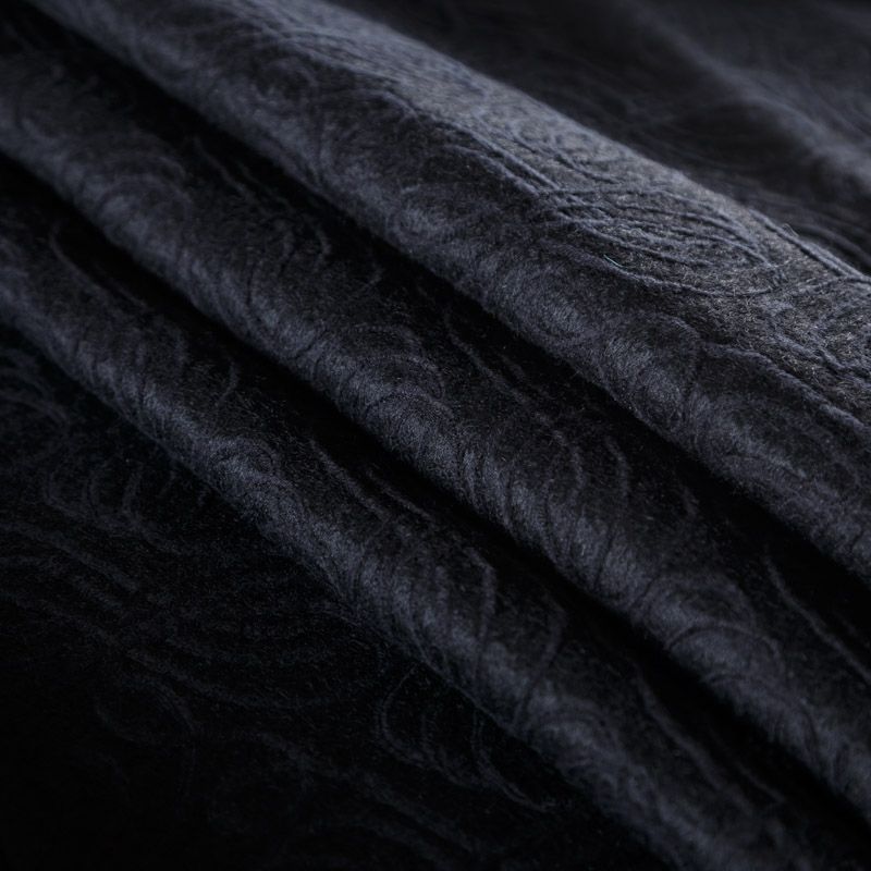Итальянская фактурная шерсть в черном цвете. Ткань хорошо держит форму, приятная на ощупь, гибкая, средней толщины, при этом высокой плотности. Подойдет для пошива теплого костюма, юбки, пальто, куртки, жакета, парки, кейпа, жакета или пончо.