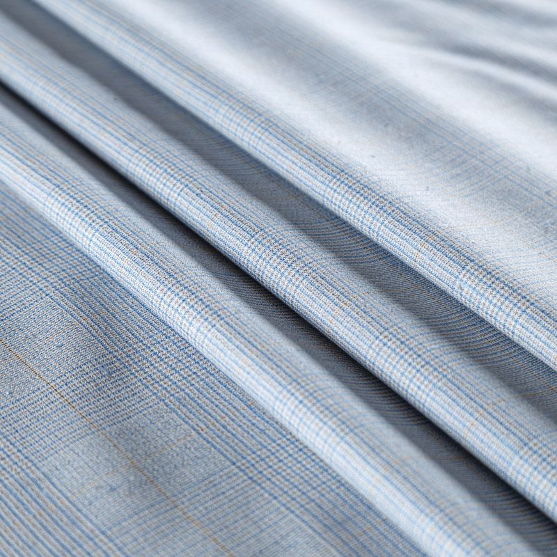 Итальянская костюмно-плательная шерсть средней плотности, мягкая и приятная на ощупь, немного тянется, формоустойчива, хорошо драпируется и образует устойчивые складки. Сочетание линий голубого, молочного и шафранового цветов образует сложную красивую клетку тартан. Ткань отлично подойдет на костюмы, юбки, брюки, платья, жакеты, для пошива школьной формы.