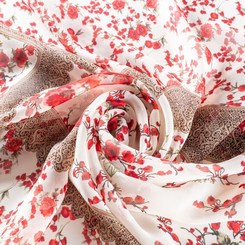 Шифон белого оттенка с мелким цветочным принтом и имитацией кружева. Струящийся, летящий, воздушный, полупрозрачный. На ощупь мягкий и приятный.Подойдет для пошива тончайших воздушных блуз, изумительных платьев со сборками и воланами и элегантных шарфов.