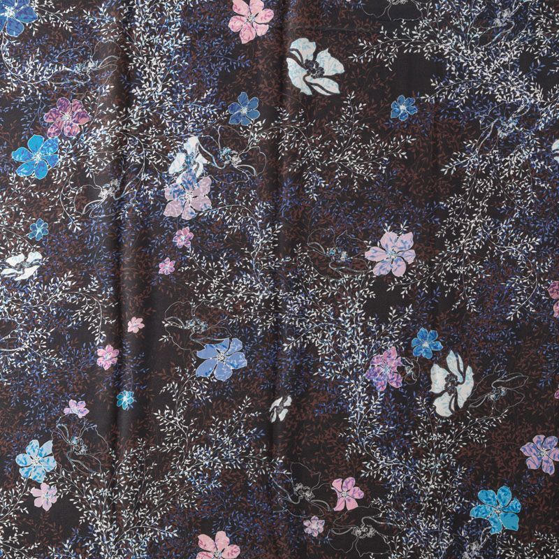 Шифон черного оттенка с растительным принтом. Струящийся, летящий, воздушный, полупрозрачный. На ощупь мягкий и приятный.Подойдет для пошива тончайших воздушных блуз, изумительных платьев со сборками и воланами и элегантных шарфов.