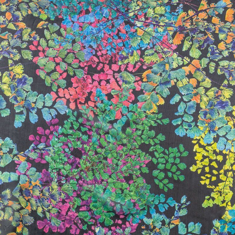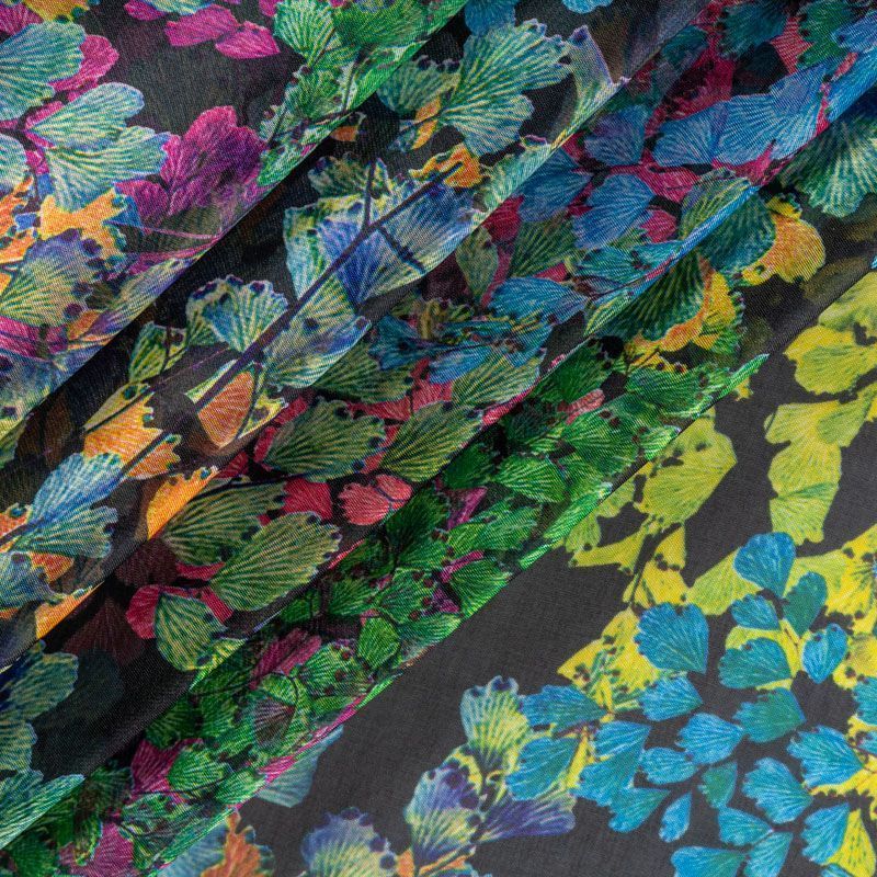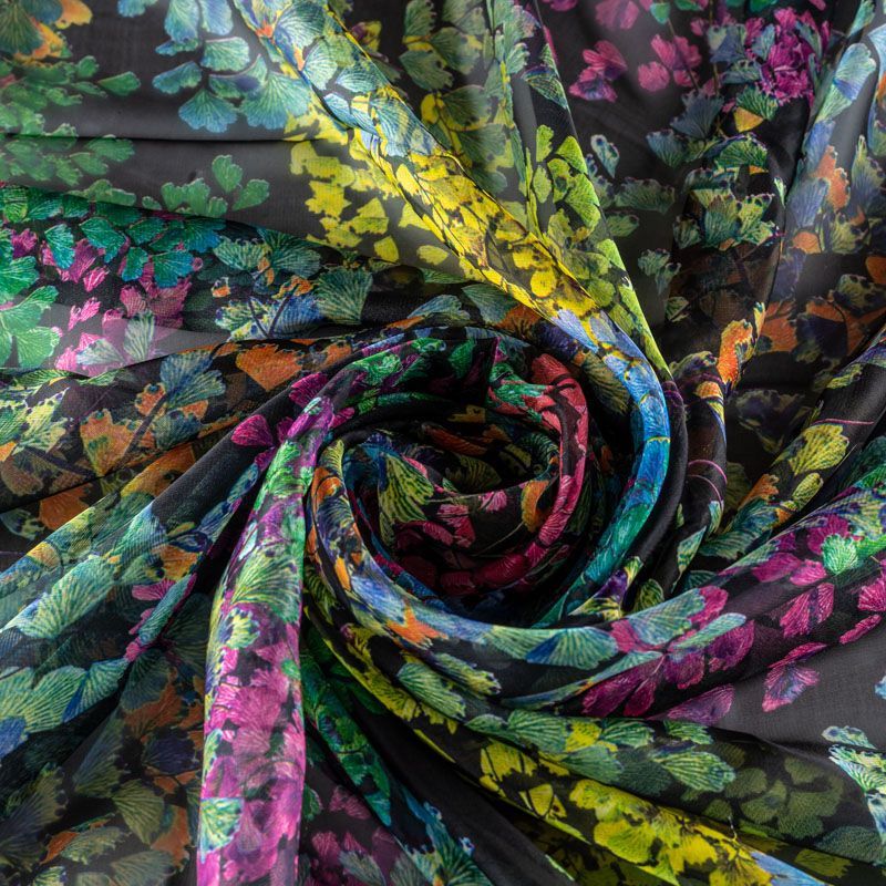 Шифон черного цвета с мелким растительным принтом в ярких оттенках. Струящийся, летящий, воздушный, полупрозрачный. На ощупь мягкий и приятный.Подойдет для пошива тончайших воздушных блуз, изумительных вечерних платьев и элегантных шарфов.