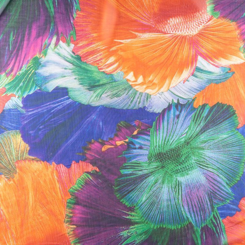 Шифон синего цвета с крупным цветочным принтом в ярких оттенках. Струящийся, летящий, воздушный, полупрозрачный. На ощупь мягкий и приятный.Подойдет для пошива тончайших воздушных блуз, изумительных вечерних платьев и элегантных шарфов.