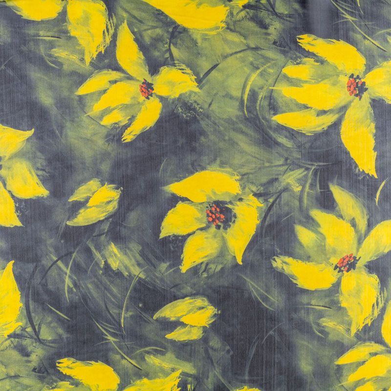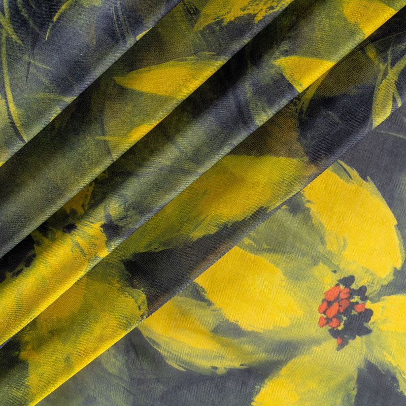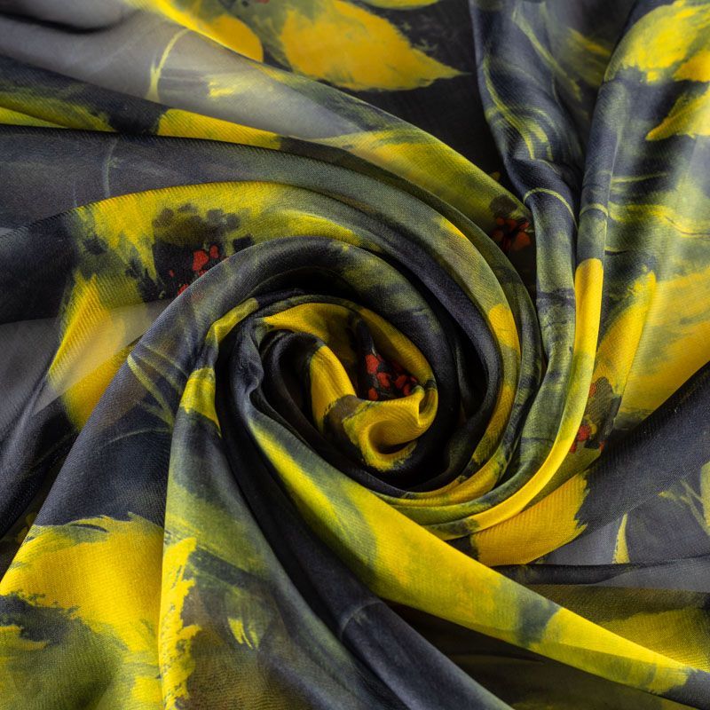 Шифон черного цвета с крупным цветочным принтом в желтых оттенках. Струящийся, летящий, воздушный, полупрозрачный. На ощупь мягкий и приятный.Подойдет для пошива тончайших воздушных блуз, изумительных вечерних платьев и элегантных шарфов.
