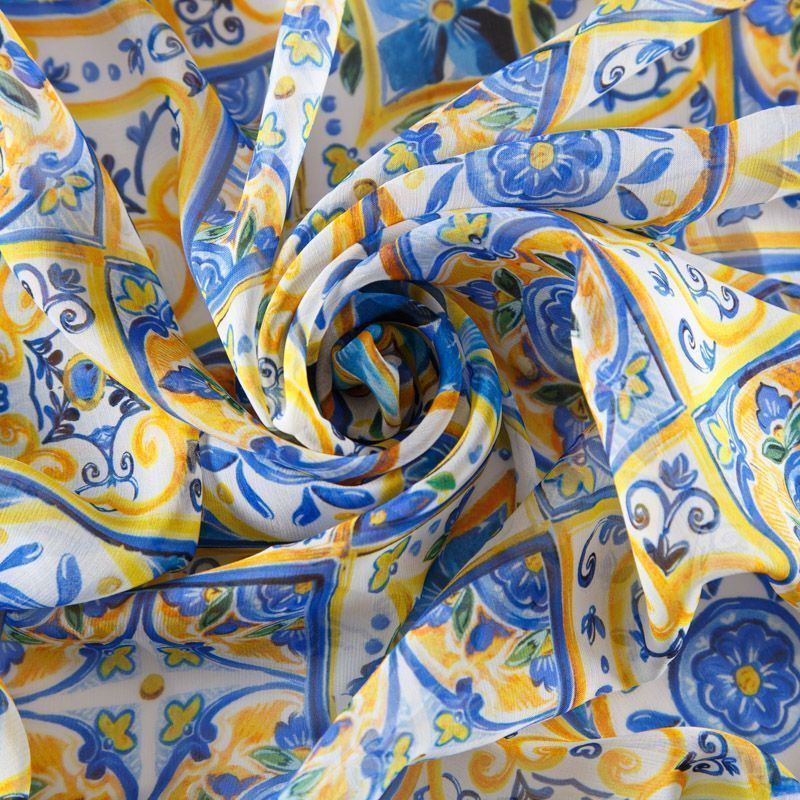 Шифон шелковый 068-12318 желто-голубой принтованный в Якутске