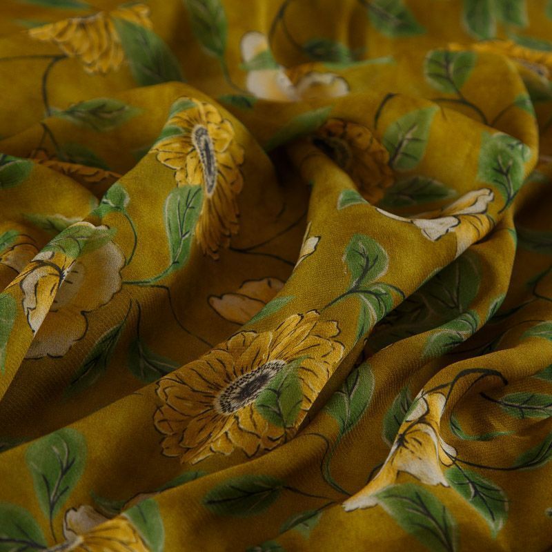 Итальянский вискозный шифон со стилизованным цветочным принтом на горчичном фоне. Ткань просвечивает, пластичная, легкая, отлично драпируется и струится. Подойдет для пошива блузки, туники, платья, юбки, парео.