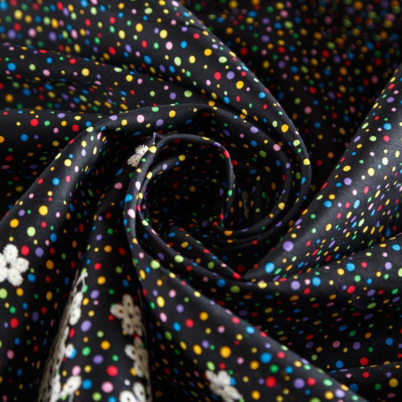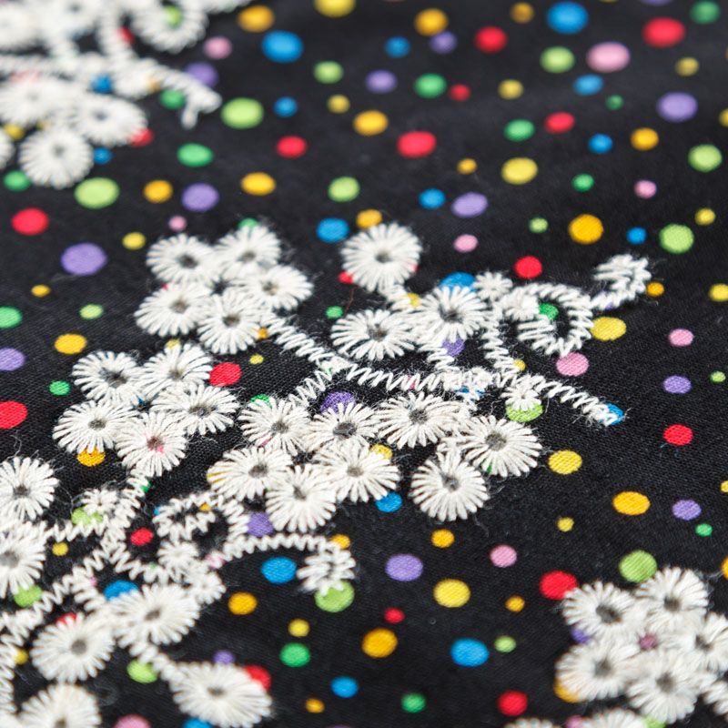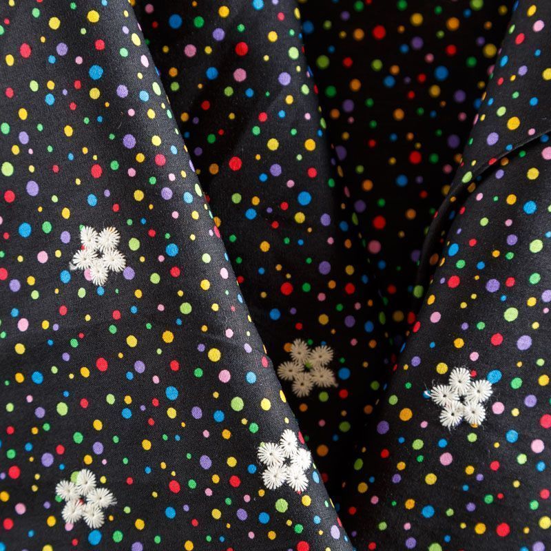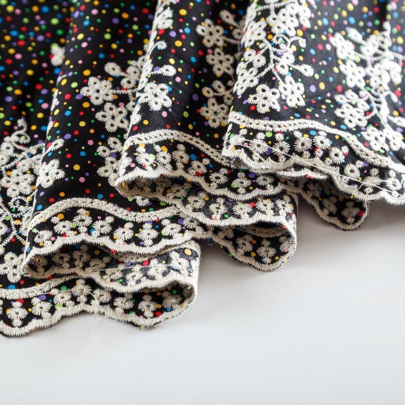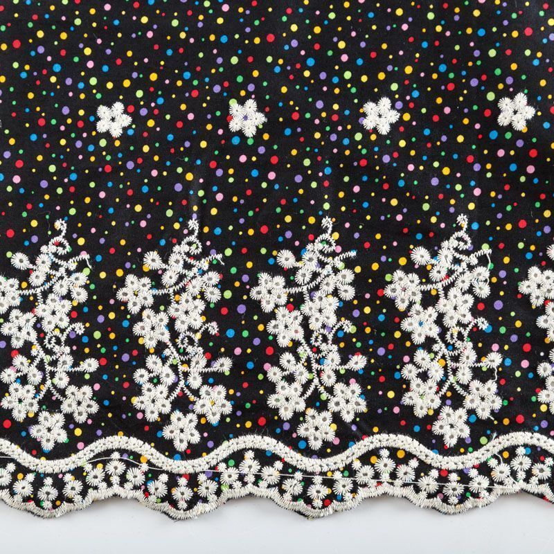 Мягкий и нежный хлопок черного цвета с мелким цветным принтом принтом украшен контрастной вышивкой.  Узор выполнен путём машинной вышивки и расположен вдоль одной кромки, образуя фестон, поэтому набирается на изделие объемом. Ткань легкая, не сухая, хорошо драпируется и держит форму, имеет тенденцию к сминаемости, не просвечивает, не тянется, приятная на ощупь. Идеально подходит для создания летних платьев, сарафанов, юбок, блузок, топов, шорт.