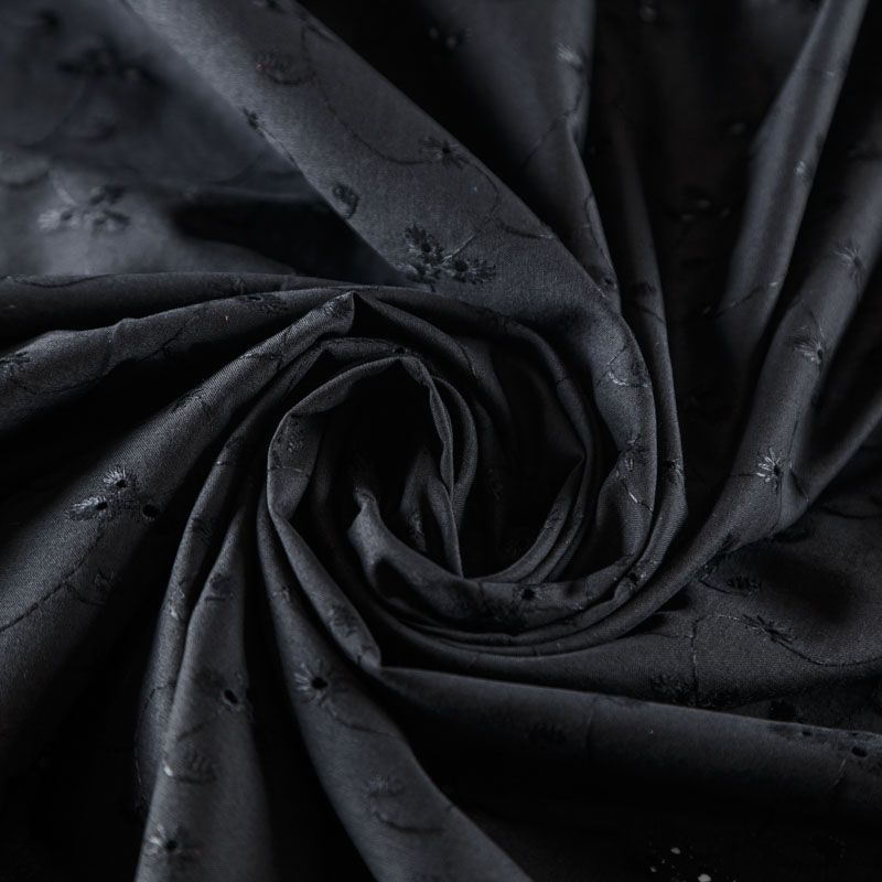 Мягкий и нежный хлопок черного оттенка с вышивкой и перфорацией. Узор выполнен путём машинной вышивки нитками в цвет ткани и расположен по всему полотну. Фактура ткани однородная, имеет тенденцию к сминаемости, не тянется, приятная на ощупь. Может потребоваться подклад. Идеально подходит для создания летних платьев, сарафанов, юбок, блузок и топов.