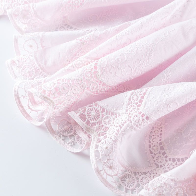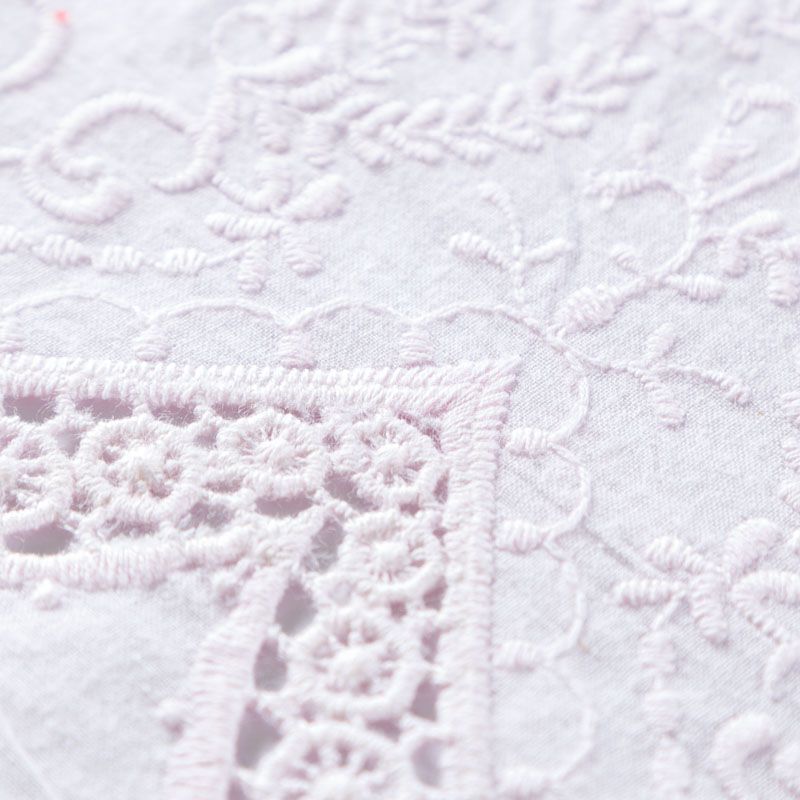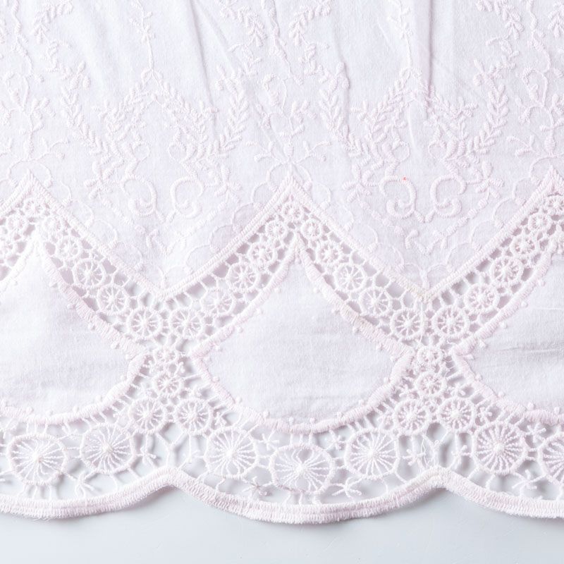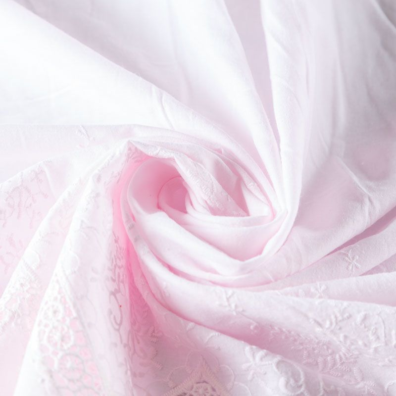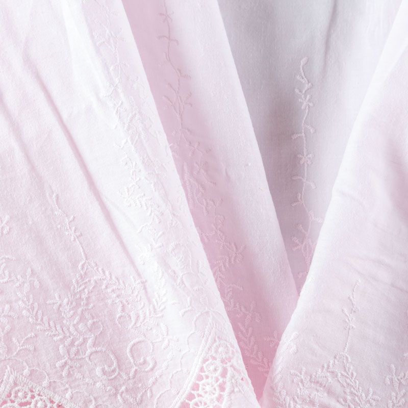 Мягкий и нежный хлопок розового оттенка с изящной вышивкой. Узор выполнен путём машинной ажурной вышивки "ришелье" нитками в цвет ткани и расположен вдоль кромки. Фактура ткани однородная, имеет тенденцию к сминаемости, просвечивает, не тянется, приятная на ощупь. Идеально подходит для создания летних платьев, сарафанов, юбок, блузок и топов.