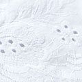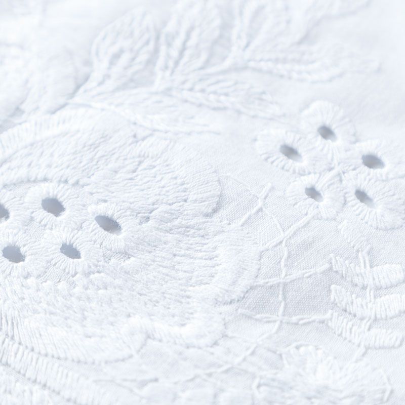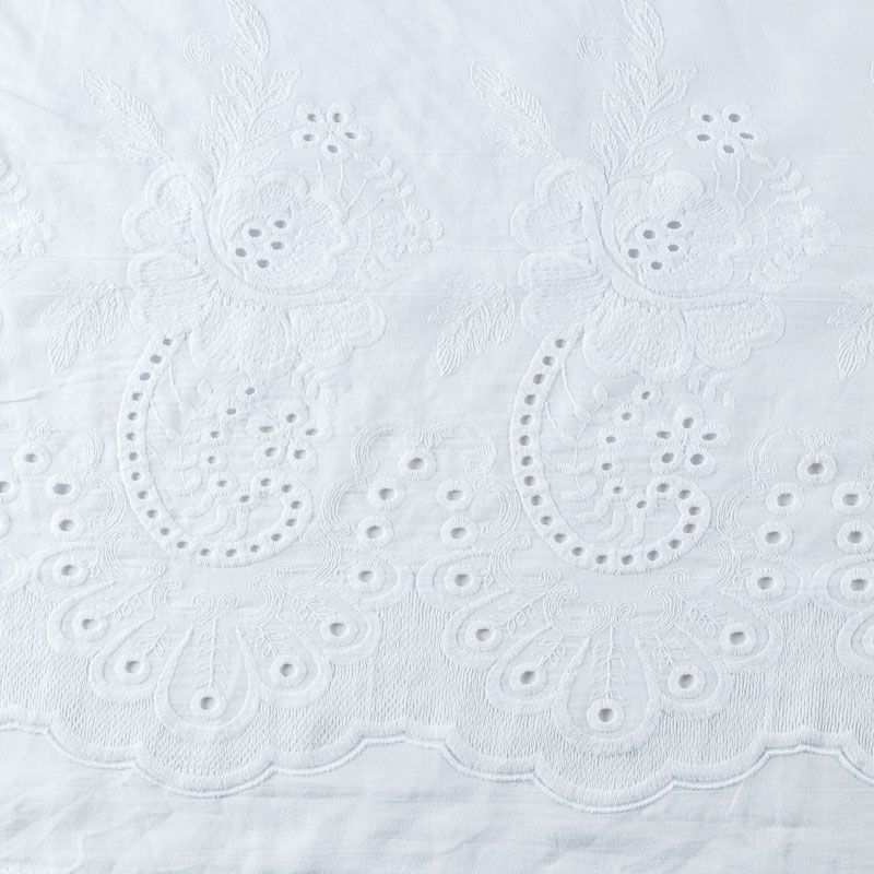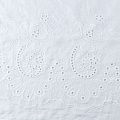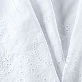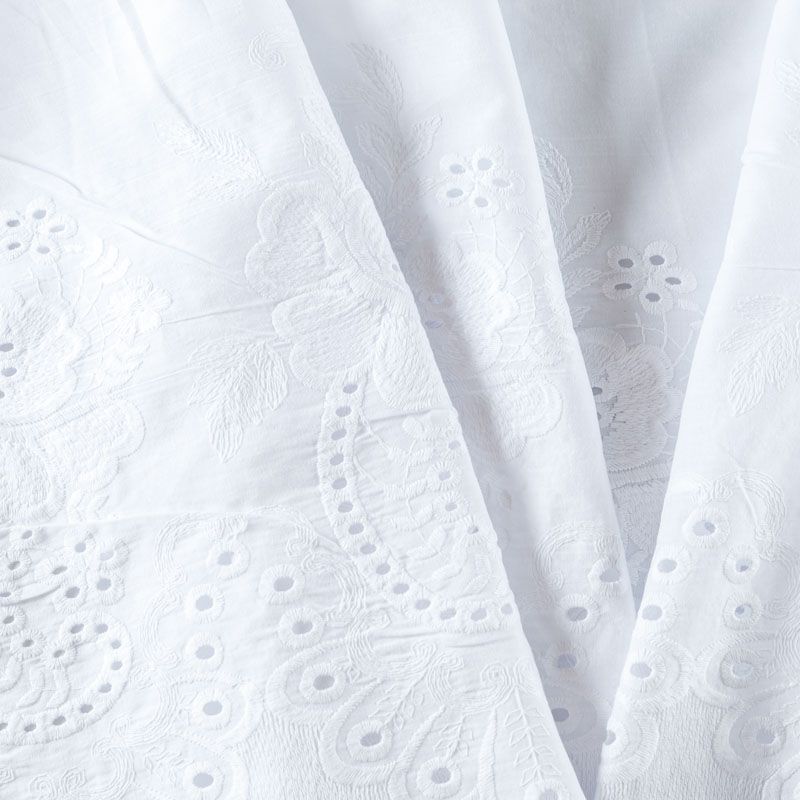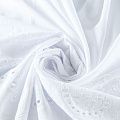 Мягкий и нежный хлопок белого оттенка с изящной вышивкой. Узор выполнен путём машинной ажурной вышивки нитками в цвет ткани и расположен вдоль кромки. Фактура ткани однородная, имеет тенденцию к сминаемости, просвечивает, не тянется, приятная на ощупь. Идеально подходит для создания летних платьев, сарафанов, юбок, блузок и топов.
