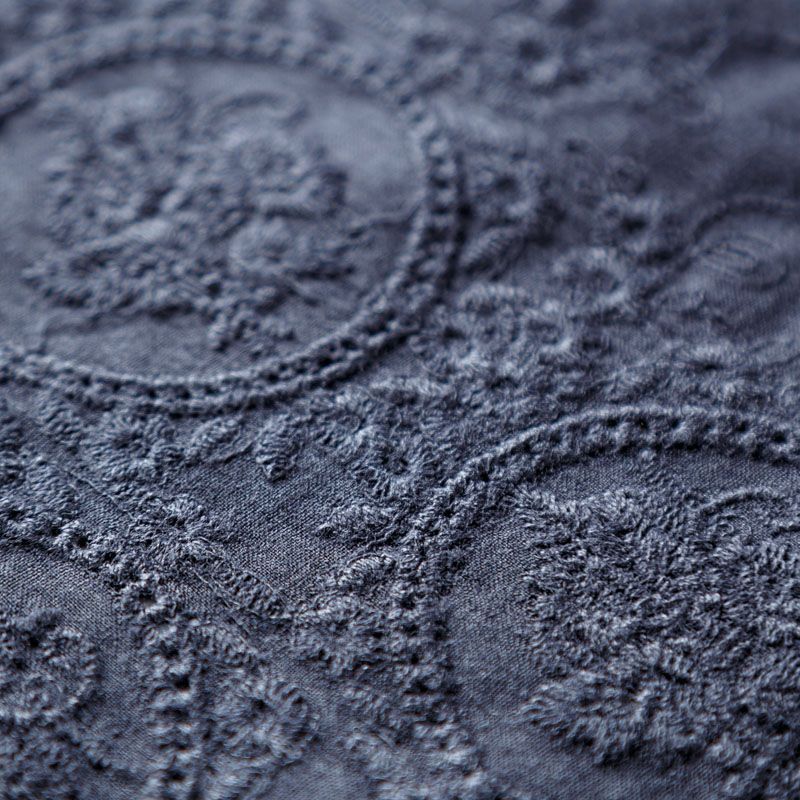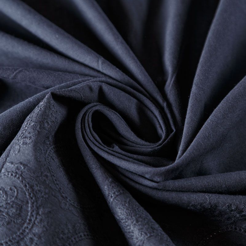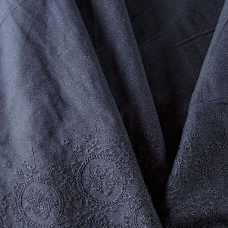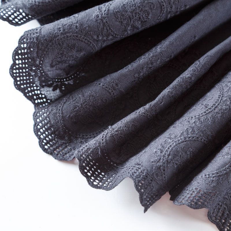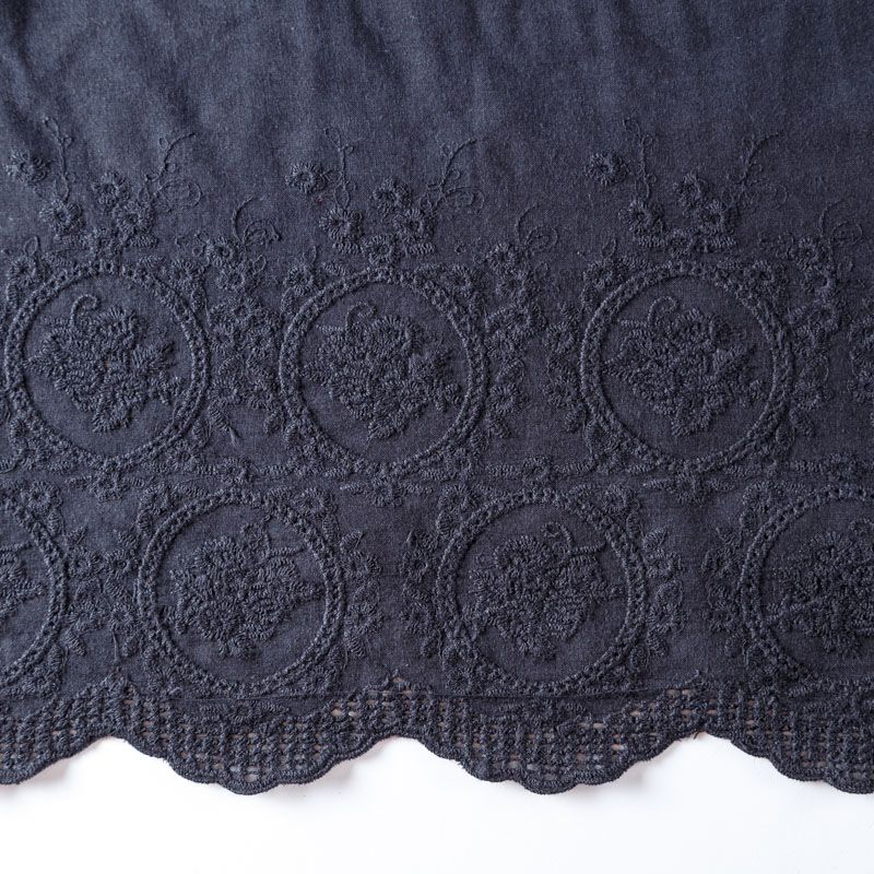 Мягкий и нежный хлопок черного оттенка с изящной вышивкой. Узор выполнен путём машинной вышивки нитками в цвет ткани и расположен вдоль кромки. Фактура ткани однородная, имеет тенденцию к сминаемости, просвечивает, не тянется, приятная на ощупь. Идеально подходит для создания летних платьев, сарафанов, юбок, блузок и топов.