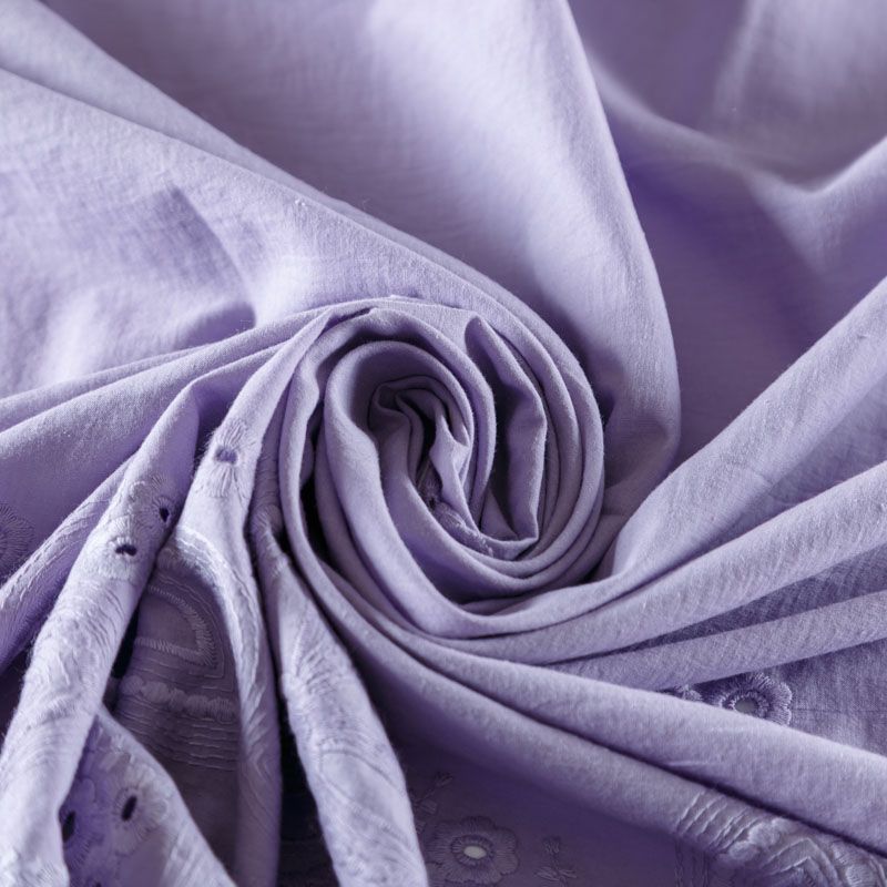 Итальянский мягкий и нежный хлопок трендового фиолетового оттенка с изящной вышивкой. Узор выполнен путём машинной ажурной вышивки нитками в цвет ткани и расположен вдоль кромки. Обе кромки ткани оформлены фигурными фестонами. Фактура ткани однородная, имеет тенденцию к сминаемости, немного просвечивает, не тянется, приятная на ощупь. Идеально подходит для создания летних платьев, сарафанов, юбок, блузок и топов.