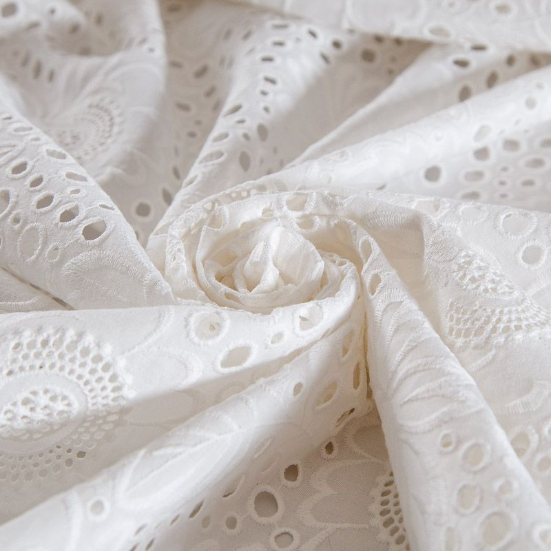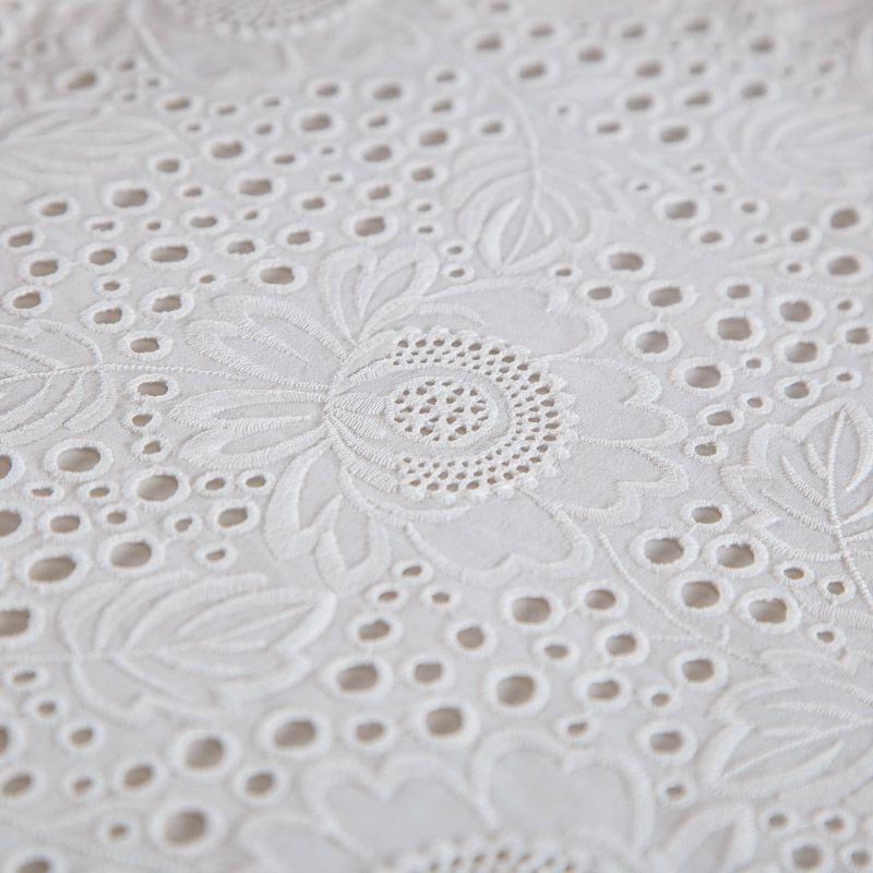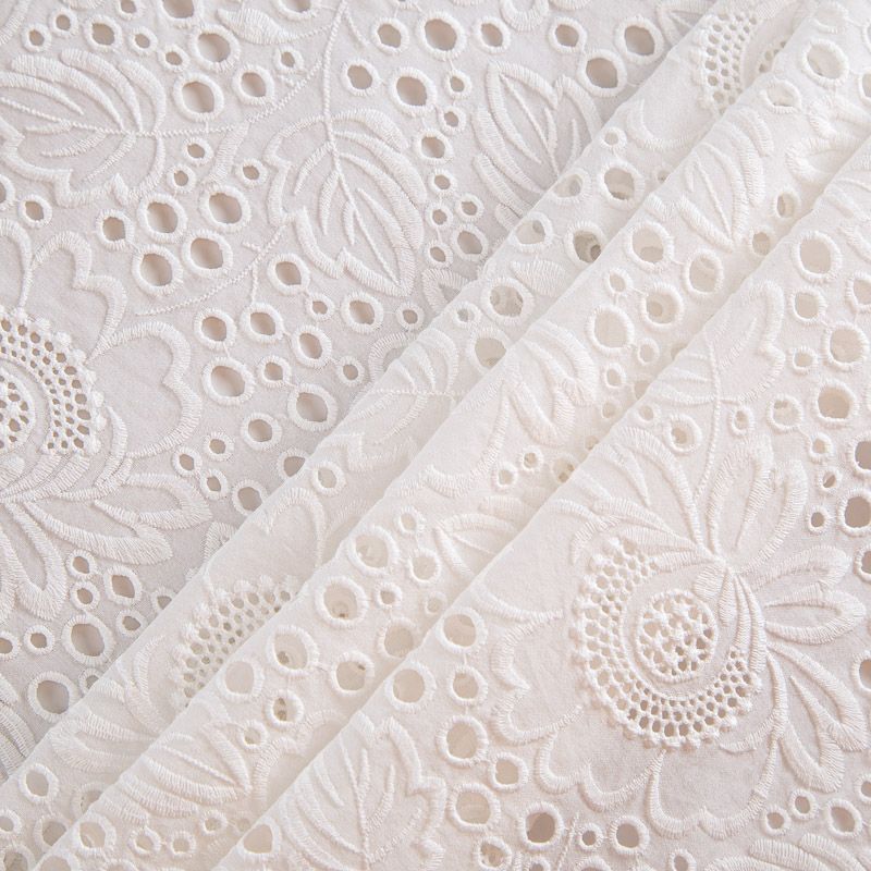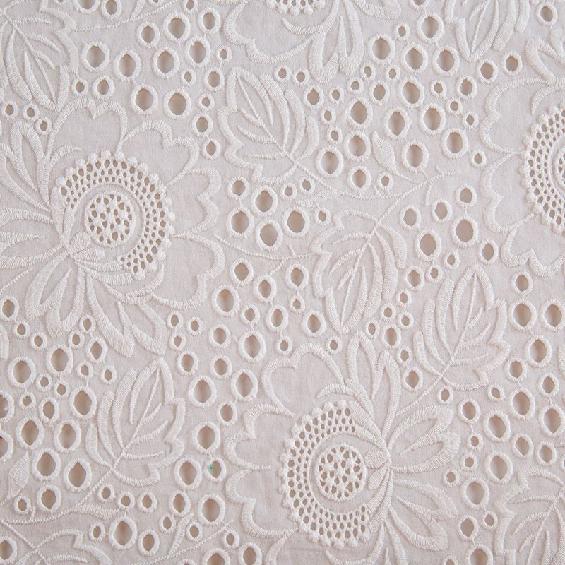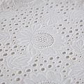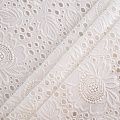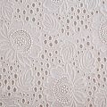 Итальянское шитье на хлопковой основе молочного оттенка цветочной вышивкой,  расположеннной по всему полотну. Узор выполнен путем машинной вышивки нитками в тон ткани. Ткань очень мягкая, приятная на ощупь, слегка просвечивает. Идеально подойдет для пошива рубашки, блузы, топа в воланами, туники, платья, сарафана, юбки, шорт.