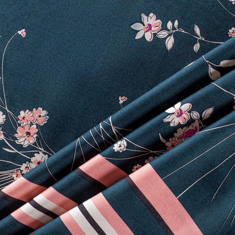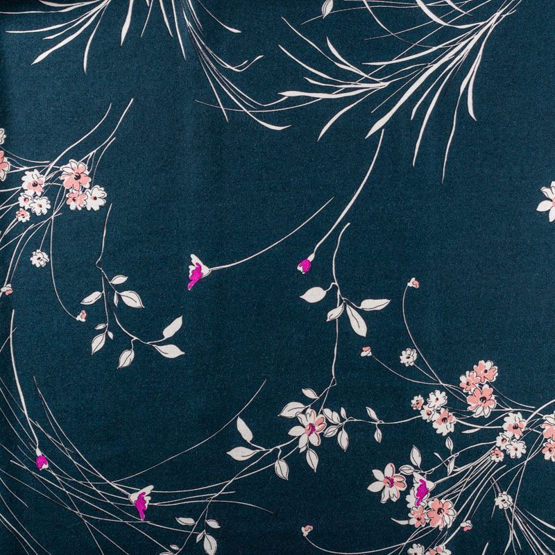 Итальянский плательно-блузочный штапель глубокого сине-зеленого оттенка с цветочным принтом и декоративным кантом вдоль кромки. Мягкий, нежный, пластичный, приятный на ощупь, хорошо драпируется, практичный. Особенно актуален летом, он очень легкий, обволакивающий прохладой. Идеален для пошива летней детской одежды, сарафанов, платьев, юбок, блузок, домашней одежды: халатов, ночной пижамы.
