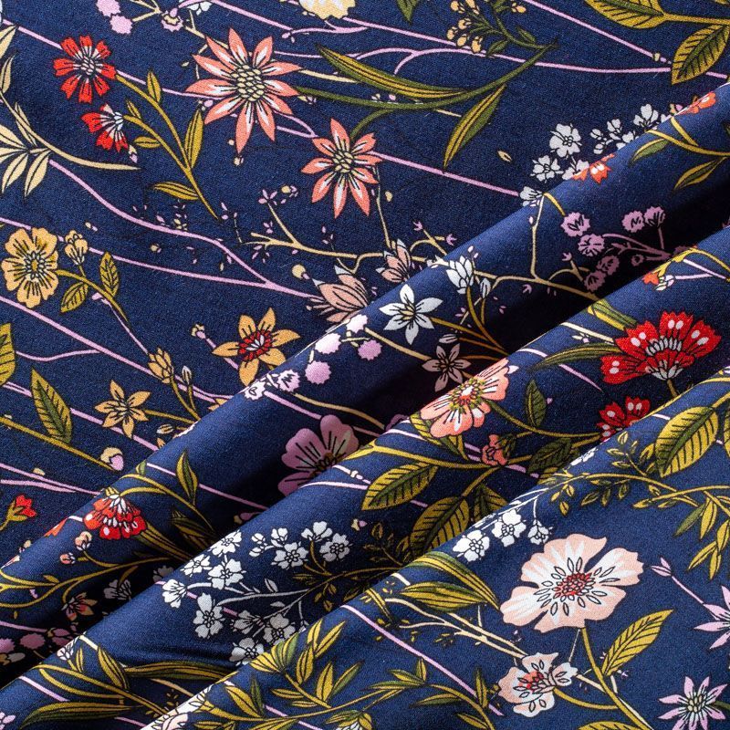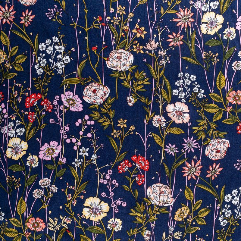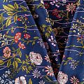 Плательно-блузочный штапель с элегантным цветочным принтом на темно-синем фоне. Мягкий, тонкий, нежный, пластичный, приятный на ощупь, хорошо драпируется, практичный. Подойдет для пошива платья, топа, блузки, рубашки, юбки, летних брюк.