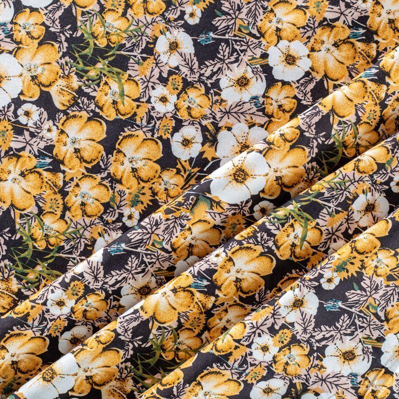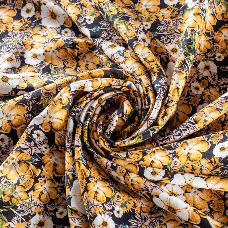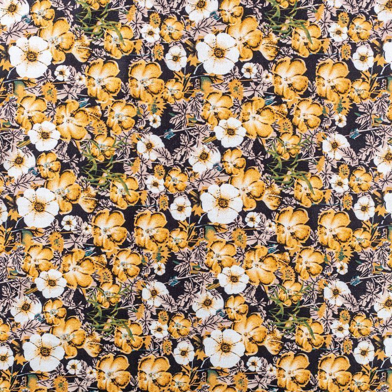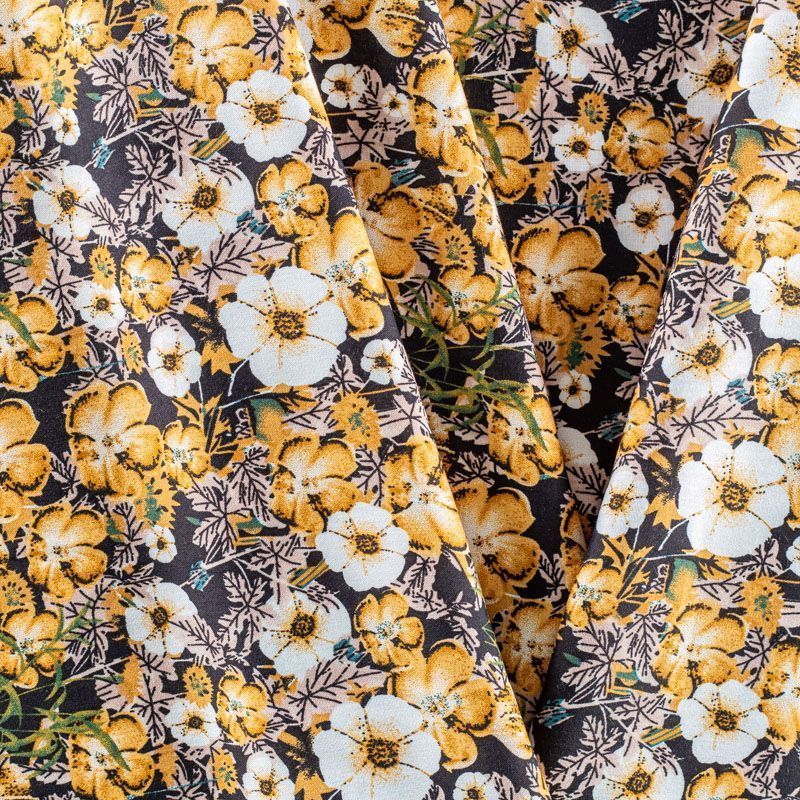Плательно-блузочный штапель с цветочным принтом в молочно-бежевых оттеннках на черном фоне. Мягкий, тонкий, нежный, пластичный, приятный на ощупь, хорошо драпируется, практичный. Подойдет для пошива платья, топа, блузки, рубашки, юбки, летних брюк.