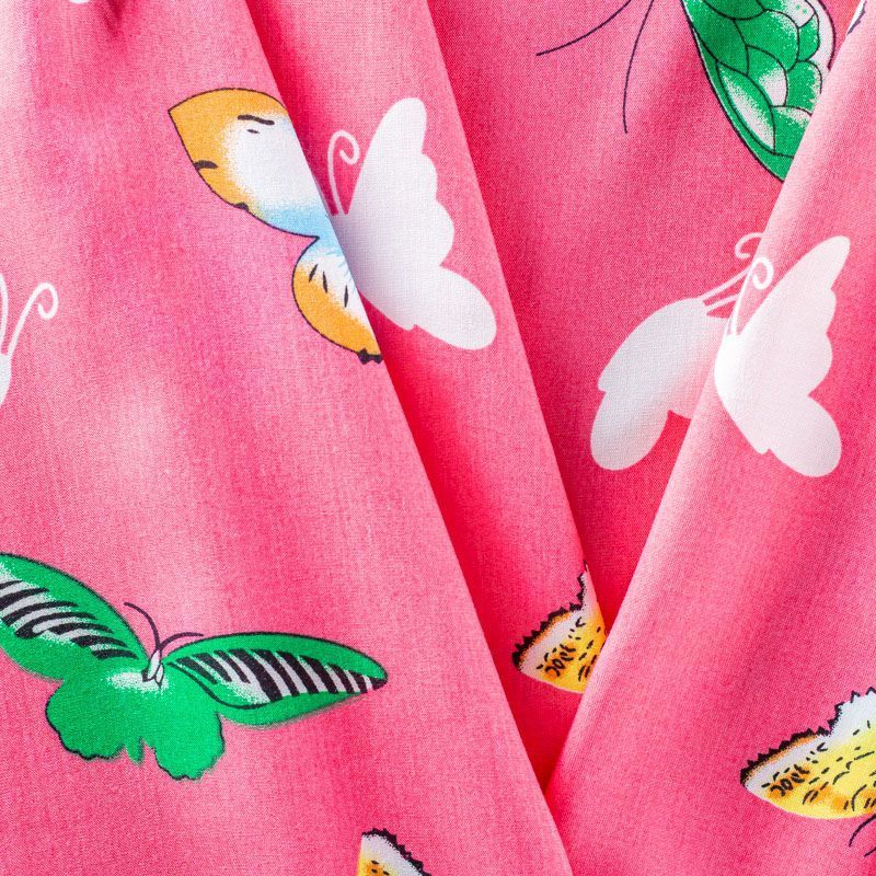 Плательно-блузочный штапель с романтичным принтом в виде цветных стилизованных бабочек на розовом фоне. Мягкий, тонкий, нежный, пластичный, приятный на ощупь, хорошо драпируется, практичный. Подойдет для пошива платья, топа, блузки, рубашки, юбки, летних брюк.