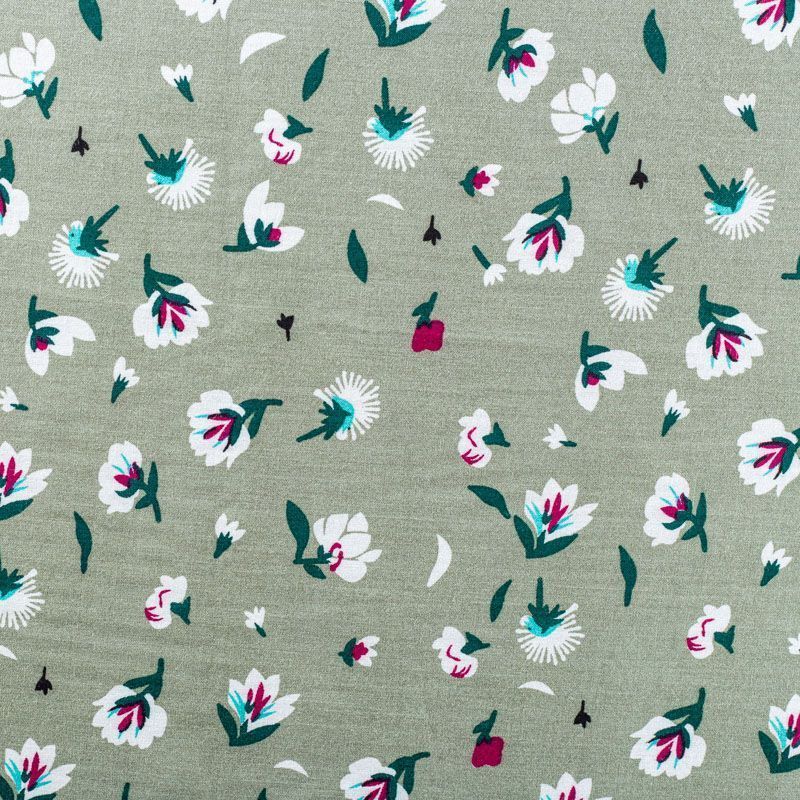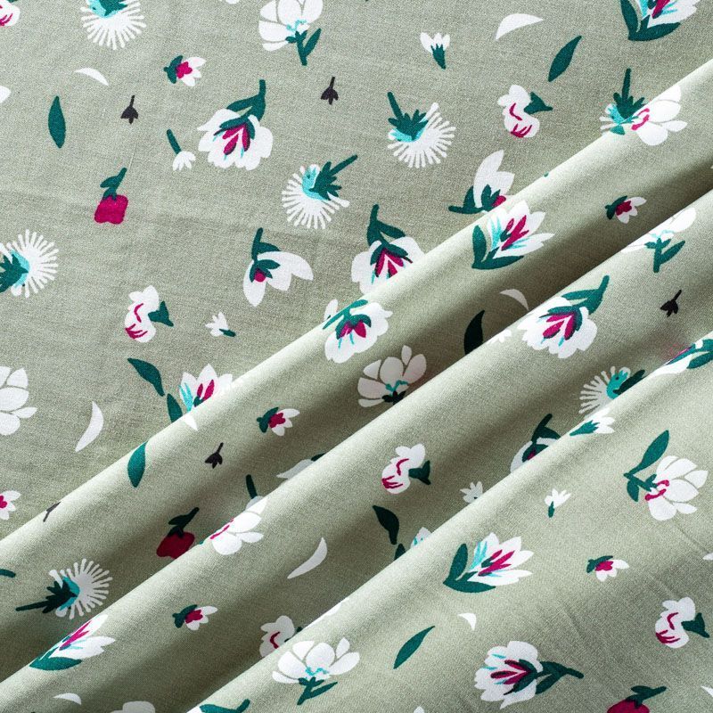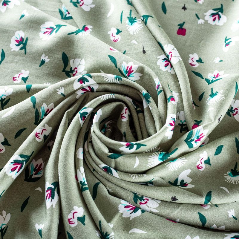 Плательно-блузочный штапель зеленого оттенка с мелким цветочным принтом. Ткань мягкая, тонкая, нежная, пластичная, приятная на ощупь, хорошо драпируется, практичная, поверхность слегка фактурная. Подойдет для пошива платья, топа, блузки, рубашки, юбки, летних брюк.
