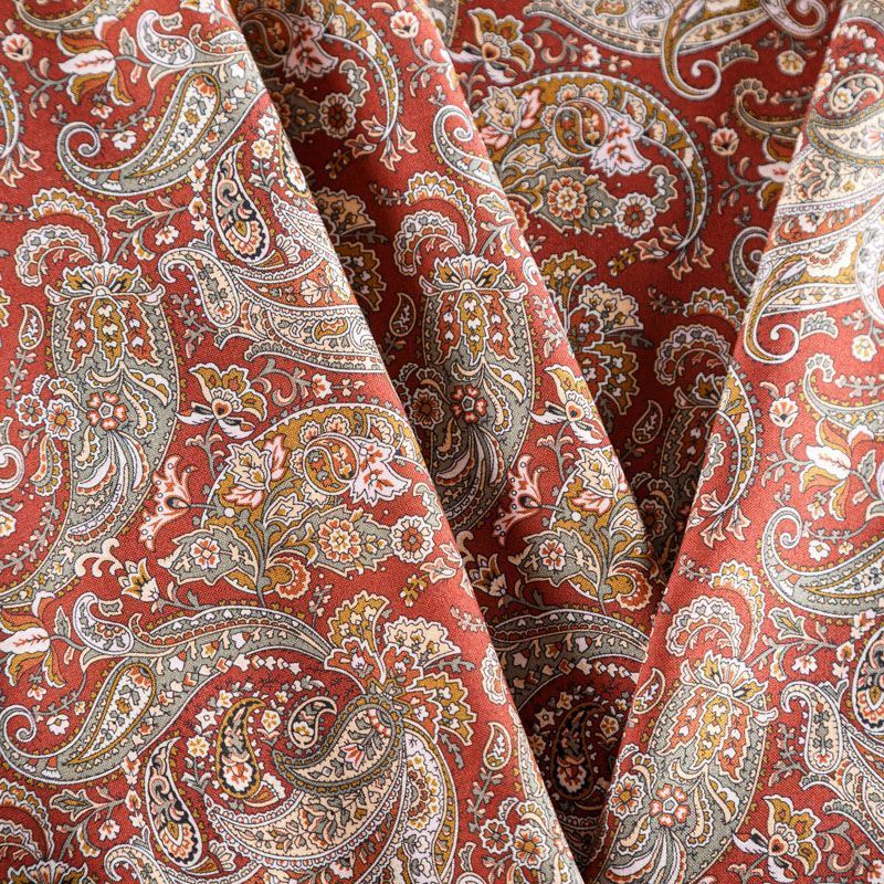 Плательно-блузочный штапель с богатым узором пейсли в серо-оливковых тонах на терракотовом фоне. Мягкий, тонкий, нежный, пластичный, приятный на ощупь, хорошо драпируется, практичный. Подойдет для пошива платья, топа, блузки, рубашки, юбки, летних брюк, комбинезона.