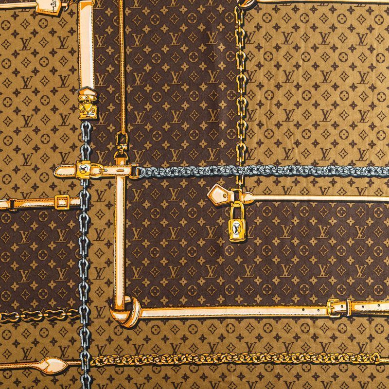 Плательно-блузочный штапель с принтом лого известного бренда в бежево-коричневых тонах. Материал мягкий, тонкий, нежный, пластичный, приятный на ощупь, хорошо драпируется, практичный. Подойдет для пошива платья сарафана, топа, блузки, рубашки, юбки, летних брюк, комбинезона, а также домашней одежды.
