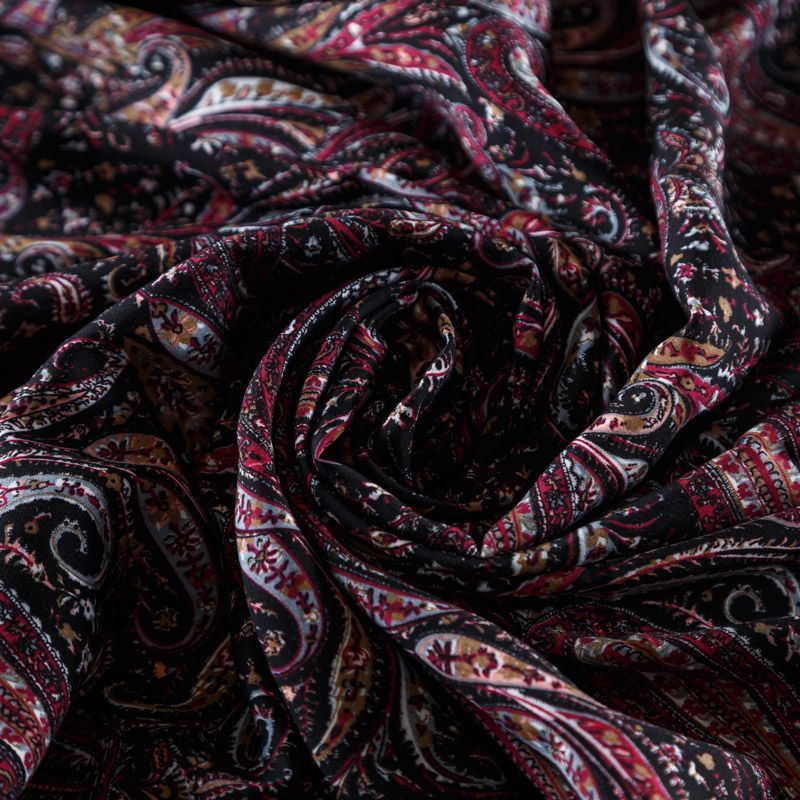 Плательно-блузочный штапель с принтом пейсли на черном фоне. Мягкий, тонкий, нежный, пластичный, приятный на ощупь, хорошо драпируется, практичный. Подойдет для пошива платья, топа, блузки, рубашки, юбки, летних брюк, комбинезона.