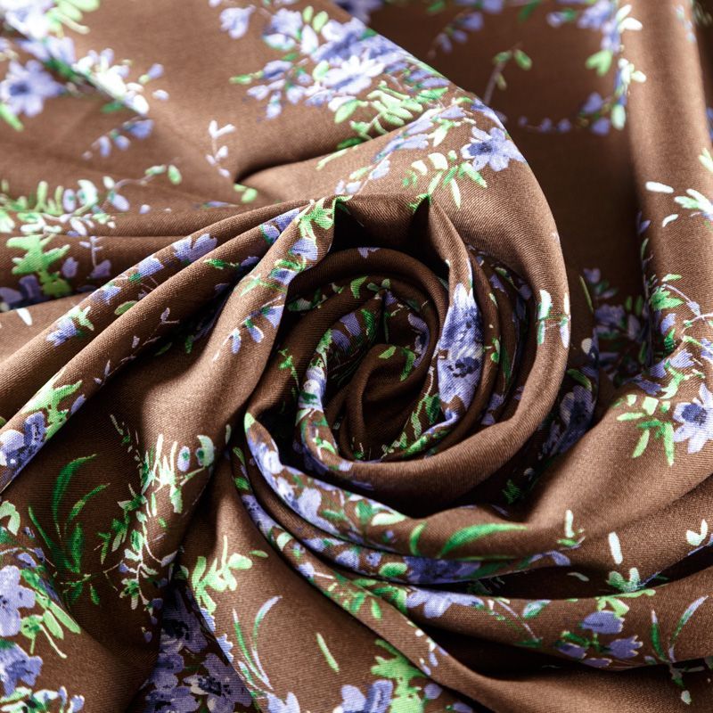 Плательно-блузочный штапель с цветочным принтом на шоколадном фоне. Мягкий, тонкий, нежный, пластичный, приятный на ощупь, хорошо драпируется, практичный. Подойдет для пошива платья, топа, блузки, рубашки, юбки, летних брюк, комбинезона, домашней одежды.