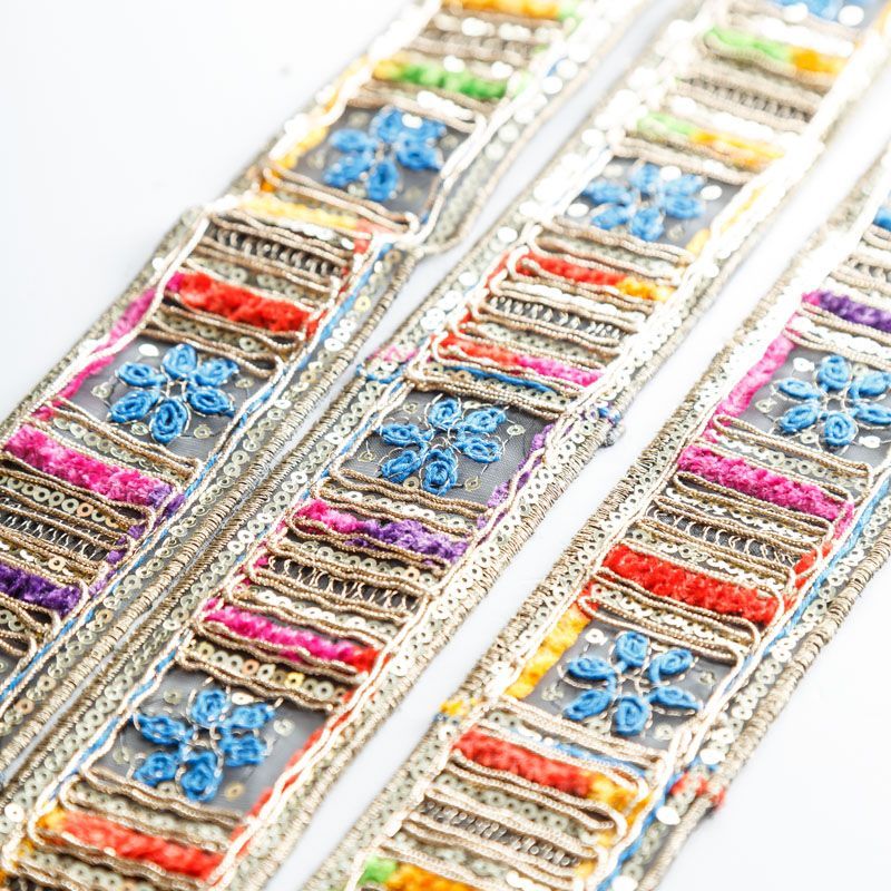 Декоративная тесьма на основе из органзы с богатым декором в виде вышивки, бисера, пайеток. Применяется для отделки одежды, украшений, поделок.