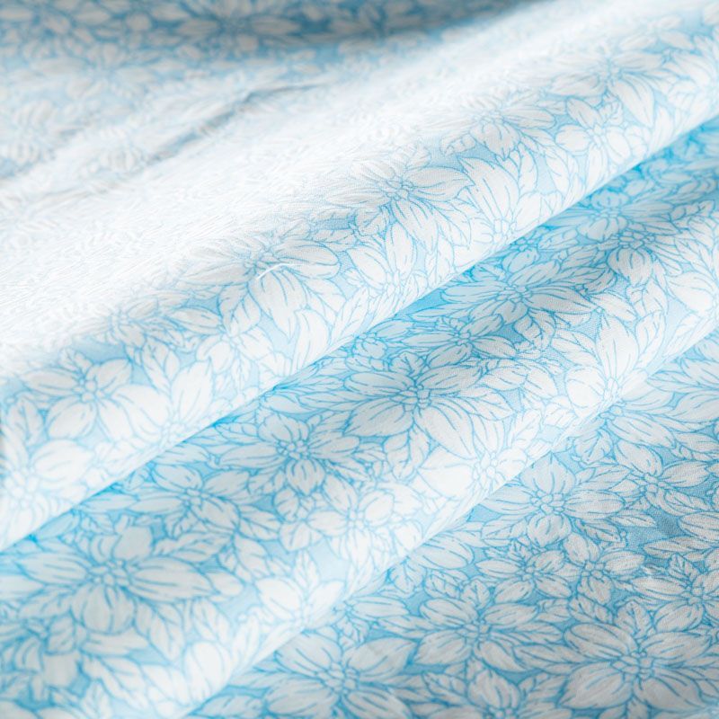 Тик приятного голубого оттенка с нежным цветочным принтом средней плотности. Используется для пошива наперников. Износостойкий, может использоваться для изготовления других изделий. Ткань подходит для любых наполнителей, искусственных и натуральных.