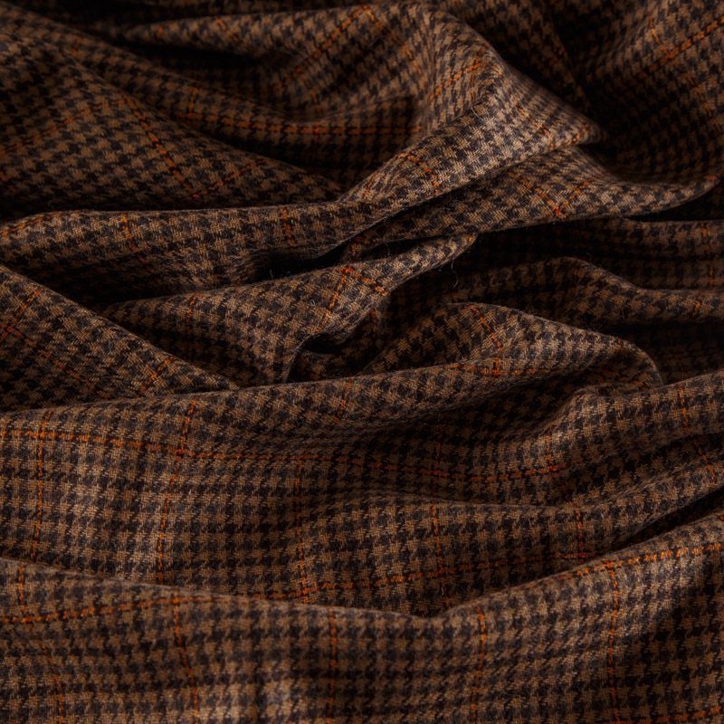 Итальянская костюмно-плательная шерсть средней плотности в коричневом оттенке в клетку тартан. Ткань не сухая, тонкая, пластичная, приятная на ощупь, почти не мнется, хорошо драпируется, тянется за счет эластана в составе. Отлично подойдет на костюм, жилет, жакет, легкое пальто, юбку, брюки, платье, сарафан, шорты.