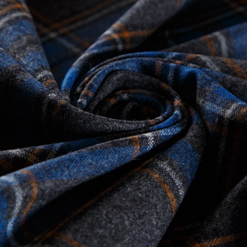 Итальянская костюмно-плательная шерсть средней плотности в графитовом оттенке, сочетание линий синего, белого, оранжевого и серого цветов образуют красивую клетку. Ткань не сухая, пластичная, приятная на ощупь, почти не мнется, хорошо драпируется. Отлично подойдет на костюм, жилет, жакет, юбку, брюки, платье, сарафан, шорты.