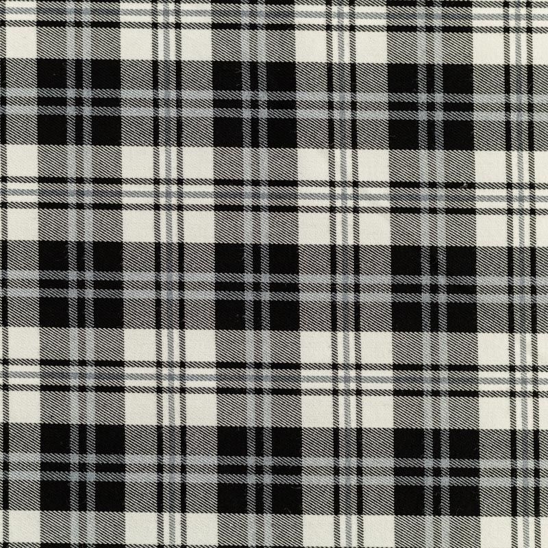 Ткань средней плотности, мягкая и приятная на ощупь, немного тянется, формоустойчива, хорошо драпируется и образует мягкие складки. Сочетание линий серого и черного цветов на белом фоне образует красивую клетку тартан. Ткань отлично подойдет на костюмы, юбки, брюки, платья, жакеты.