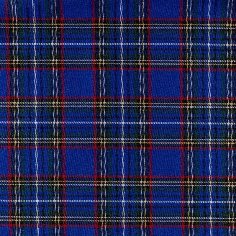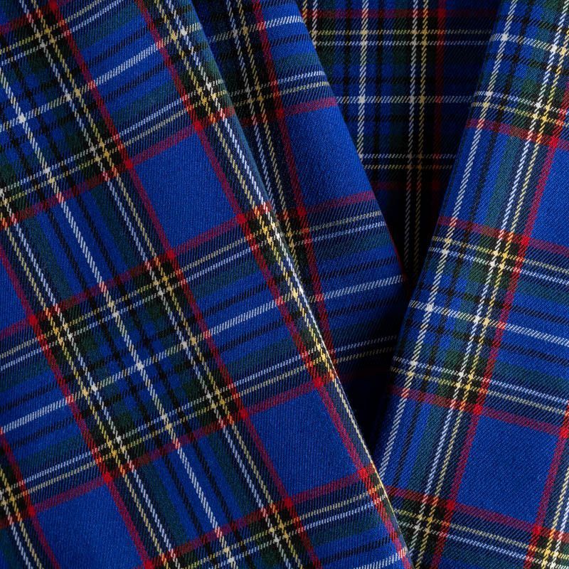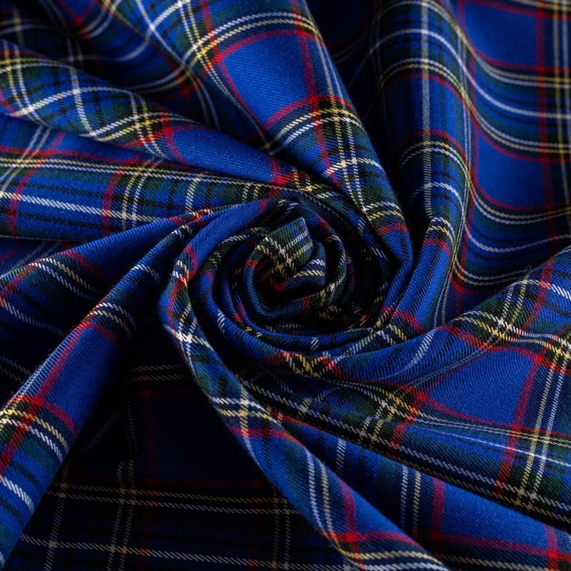 Ткань средней плотности, мягкая и приятная на ощупь, немного тянется, формоустойчива, хорошо драпируется и образует мягкие складки. Сочетание тонких линий желтого, зеленого, красного, черного и белого цветов на ярком васильковом фоне образует сложную красивую клетку тартан. Ткань отлично подойдет на костюмы, юбки, брюки, платья, жакеты.