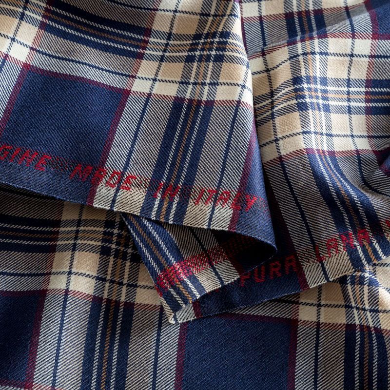 Итальянская костюмная шерсть средней плотности, мягкая и приятная на ощупь, формоустойчива, хорошо драпируется и образует мягкие складки. Сочетание линий синего, бежевого, красного и белого цветов образует сложную красивую клетку тартан. Ткань отлично подойдет на костюмы, юбки, брюки, платья, сарафаны, жакеты, для школьной формы.