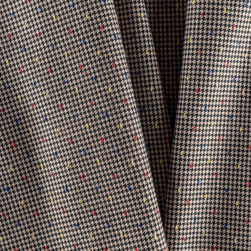 Костюмная ткань средней плотности с добавлением вискозы. Мягкая и слегка рельефная, с мелким геометрическим принтом - гусиная лапка, дополненным цветными точками. Полотно очень приятное на ощупь, не мнется, не сухая, пластичная, отлично драпируется. Идеально подойдет для костюма, жакета или жилета, брюк, а также юбок и платьев.