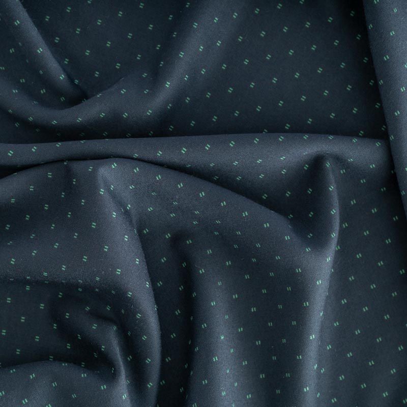 Восхитительная костюмная ткань глубокого темно-синего цвета с мелкими вкраплениями нитки мятного оттенка. Почти не мнется, приятная к телу, прекрасно драпируется, не сухая, пластичная, хорошо тянется. В косом крое ляжет красивыми ниспадающими складками. Идеально подойдет для костюма, брюк, а также юбок и платьев.