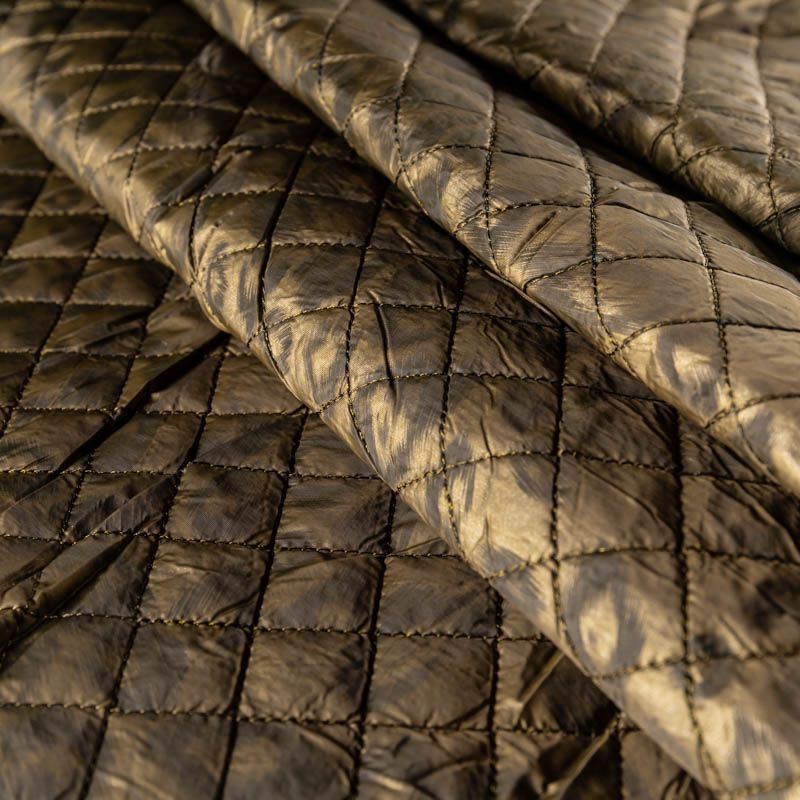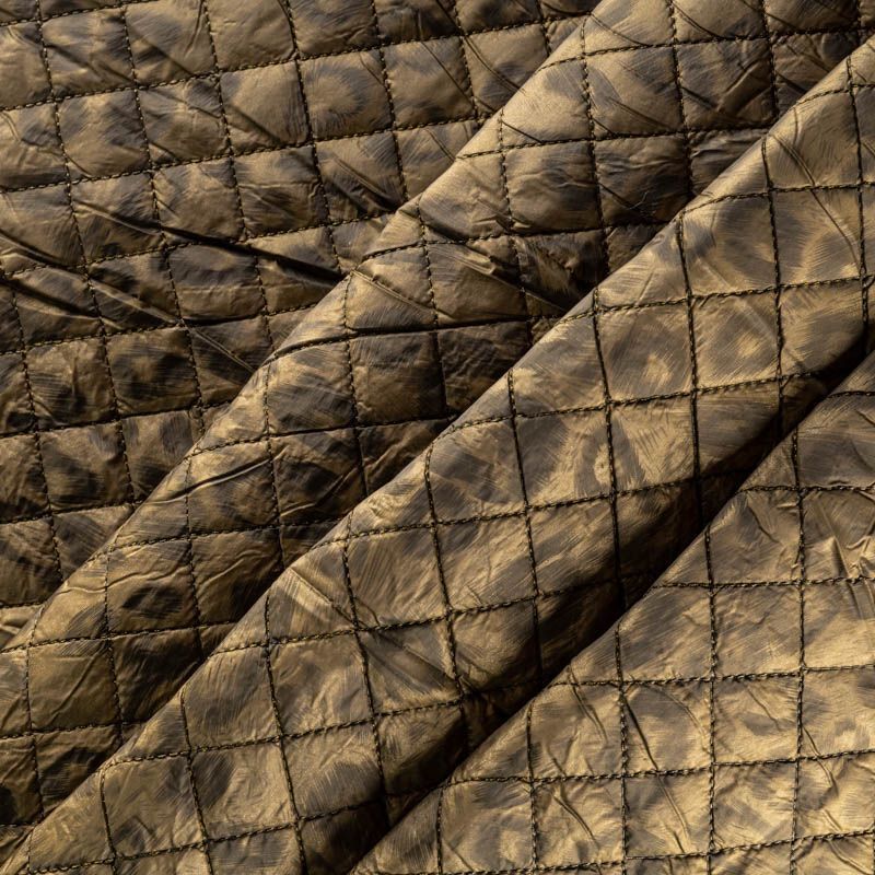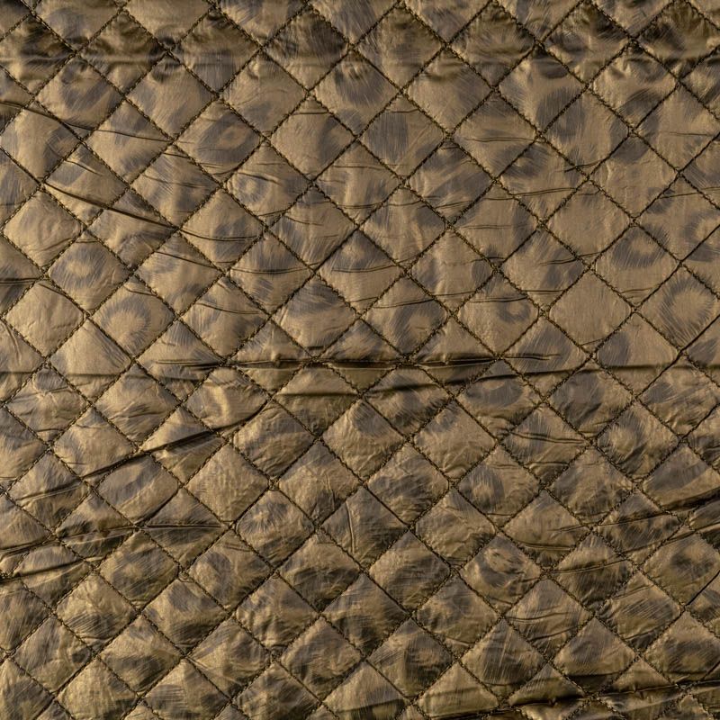 Двухслойная курточная ткань цвета хаки с неброским, но акцетным анималистическим принтом, простеганная не крупными ромбами размером 2х2 см. Нижний слой - синтепон, верхний - полиэстер, по качеству напоминает болонь. Очень мягкая и легкая, пластичная, хорошо драпируется. Прекрасно подойдет для  пошива легких пальто, курток, жилетов, накидок-кейпов, объемных сумок.