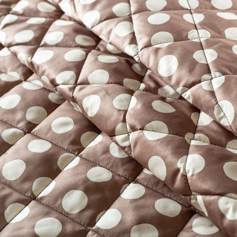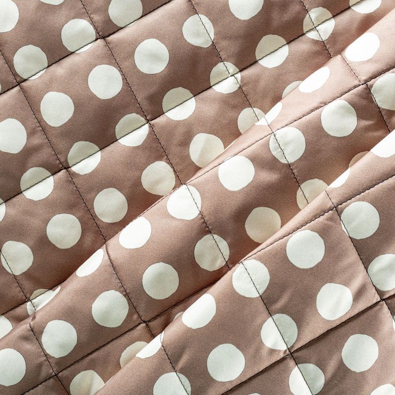 Трехслойная итальянская курточная ткань теплого серого оттенка в белый горох, простеганная не крупными ромбами размером 3х3 см. Нижний слой черного цвета, заменяет подклад, средний слой - синтепон, верхний слой - матовый полиэстер, напоминающий болонь. Ткань легкая, пластичная, хорошо драпируется. Прекрасно подойдет для  пошива легких пальто, курток, бомберов, жилетов, накидок-кейпов, объемных сумок, одежды для домашних питомцев, туристического снаряжения.