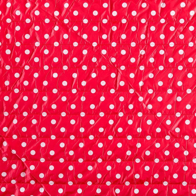 Двухслойная курточная ткань красного оттенка в белый горох, простеганная вертикальными линиями вдоль кромки. Нижний слой - синтепон, верхний - полиэстер, по качеству напоминает болонь. Очень мягкая и легкая, пластичная, хорошо драпируется. Прекрасно подойдет для пошива легких пальто, курток, жилетов, накидок-кейпов, объемных сумок.