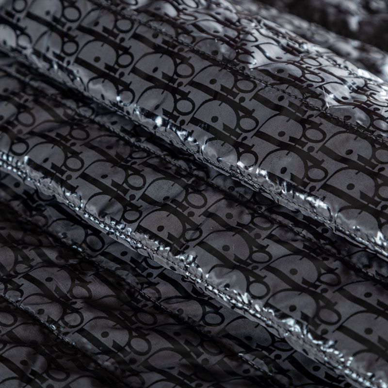 Итальянская двухслойная курточная ткань черного цвета с глитерным принтом лого известного бренда, простеганная вертикальными линиями вдоль кромки. Нижний слой - синтепон, верхний - полиэстер, по качеству напоминает болонь. Очень мягкая и легкая, пластичная, хорошо драпируется. Прекрасно подойдет для пошива легких пальто, курток, жилетов, накидок-кейпов, комбинезонов, объемных сумок, одежды для домашних питомцев, туристического снаряжения.