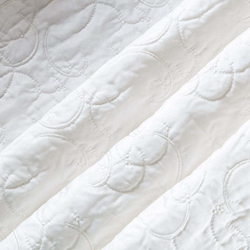 Двухслойная курточная ткань молочного оттенка, с абстрактной стежкой нитками в тон полотну. Нижний слой - синтепон, верхний -  полиэстер, по качеству напоминает болонь. Ткань легкая, пластичная, хорошо драпируется. Прекрасно подойдет для  пошива пальто, курток, жилетов, накидок-кейпов, объемных сумок, одежды для домашних питомцев, туристического снаряжения.