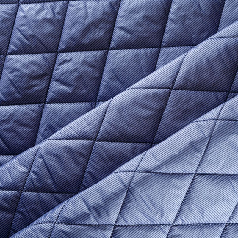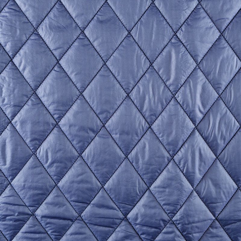 Двухслойная курточная ткань сине-голубого благородного оттенка с тонкими полосками темно-синего цвета, простеганная не крупными ромбами размером 5х5 см. Нижний слой - синтепон, верхний - полиэстер, по качеству напоминает болонь. Очень мягкая и легкая, пластичная, хорошо драпируется. Прекрасно подойдет для  пошива легких пальто, курток, жилетов, накидок-кейпов, объемных сумок.