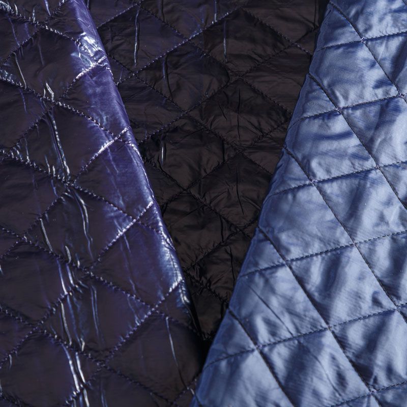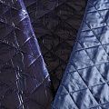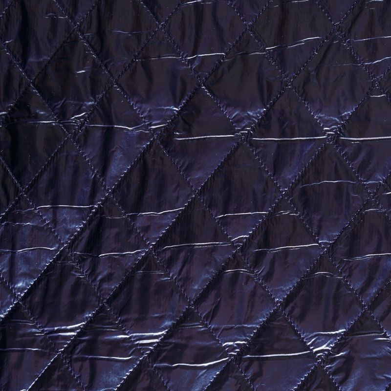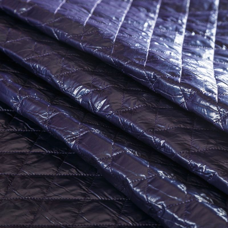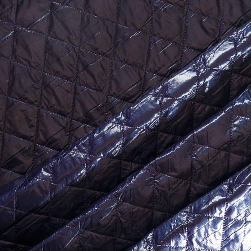 Трехслойная курточная ткань синего оттенка, простеганная не крупными ромбами. Нижний слой - матовый фактурный полиэстер, средний - тонкий синтепон, верхний - глянцевая гладкая плащевка. Очень мягкая и легкая, пластичная, хорошо драпируется. Прекрасно подойдет для  пошива легких пальто, бомберов, парки, курток, жилетов, накидок-кейпов, объемных сумок.