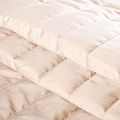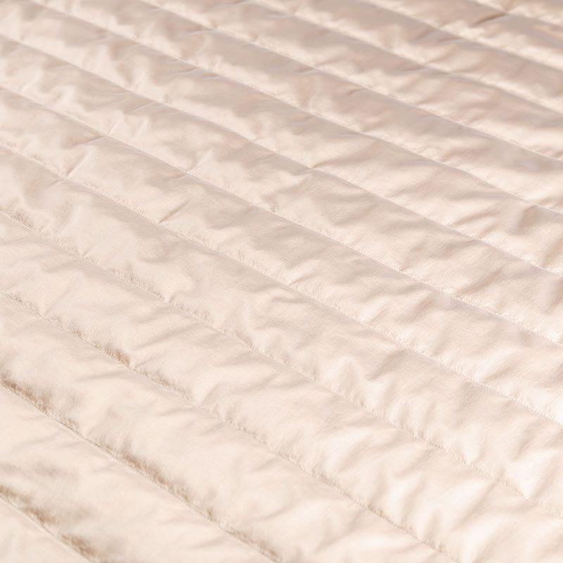 Итальяская двухслойная курточная ткань золотисто-бежевого оттенка, простеганная широкими полосами вдоль кромки. Нижний слой - воздушный синтепоновый утеплитель, верхний - матовая, слегка жатая плотная плащевая ткань. Очень мягкая и легкая, пластичная, хорошо драпируется. Прекрасно подойдет для  пошива легких пальто, бомберов, парки, курток, жилетов, накидок-кейпов, объемных сумок.